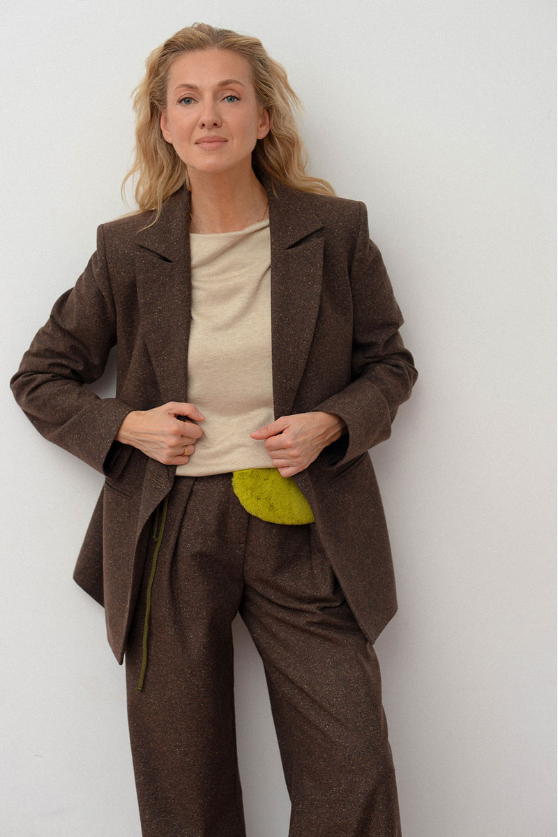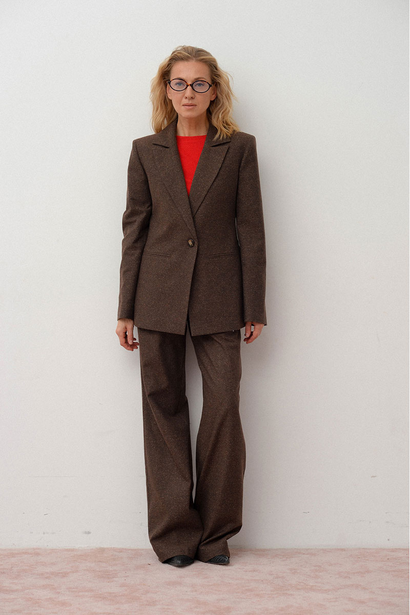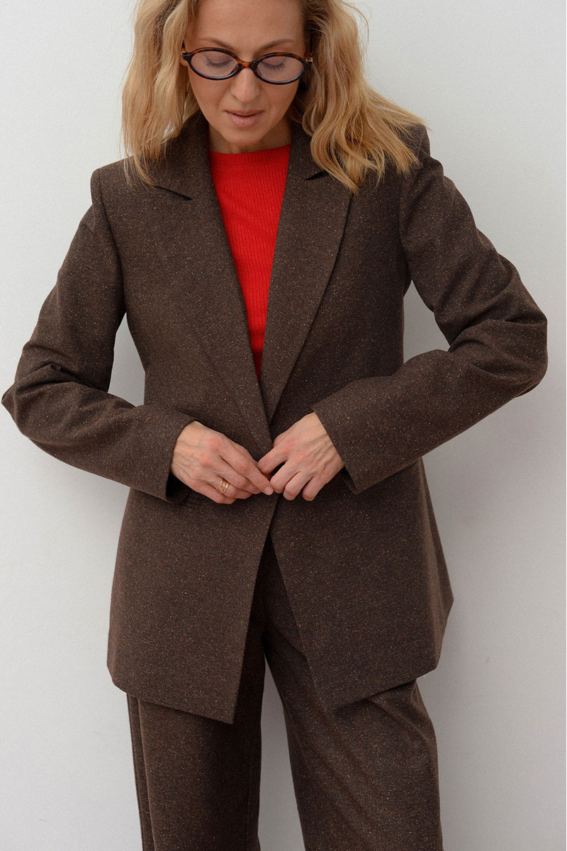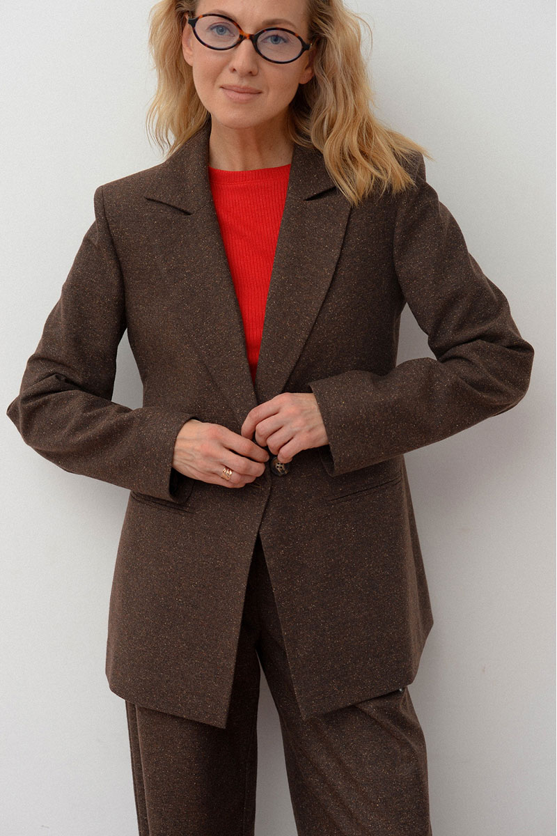 Жакет в меланжевом оттенке шоколада. Создан из премиальной итальянской шерсти с шелком. Ткань отличается своей мягкой ворсистой текстурой, отлично держит форму и сохраняет тепло. Формирует идеальный силуэт благодаря сочетанию плавных линий и акценту на талии, позволяет подчеркнуть фигуру. Благодаря комфортному подкладу из твила, изделие приятно ощущается на теле и удобно надевается поверх других вещей. Два прорезных кармана, застегивается на одну пуговицу. Идеально сочетается с костюмными брюками из нашей коллекции.
