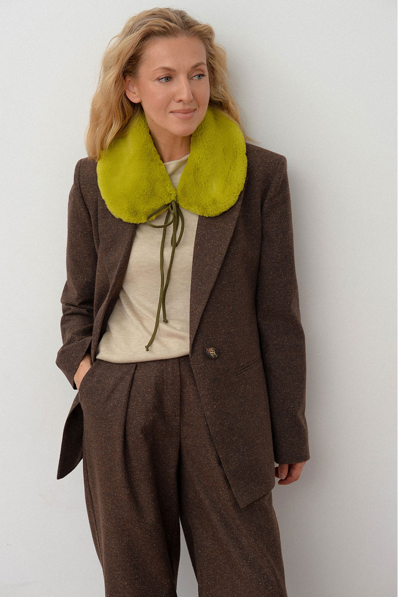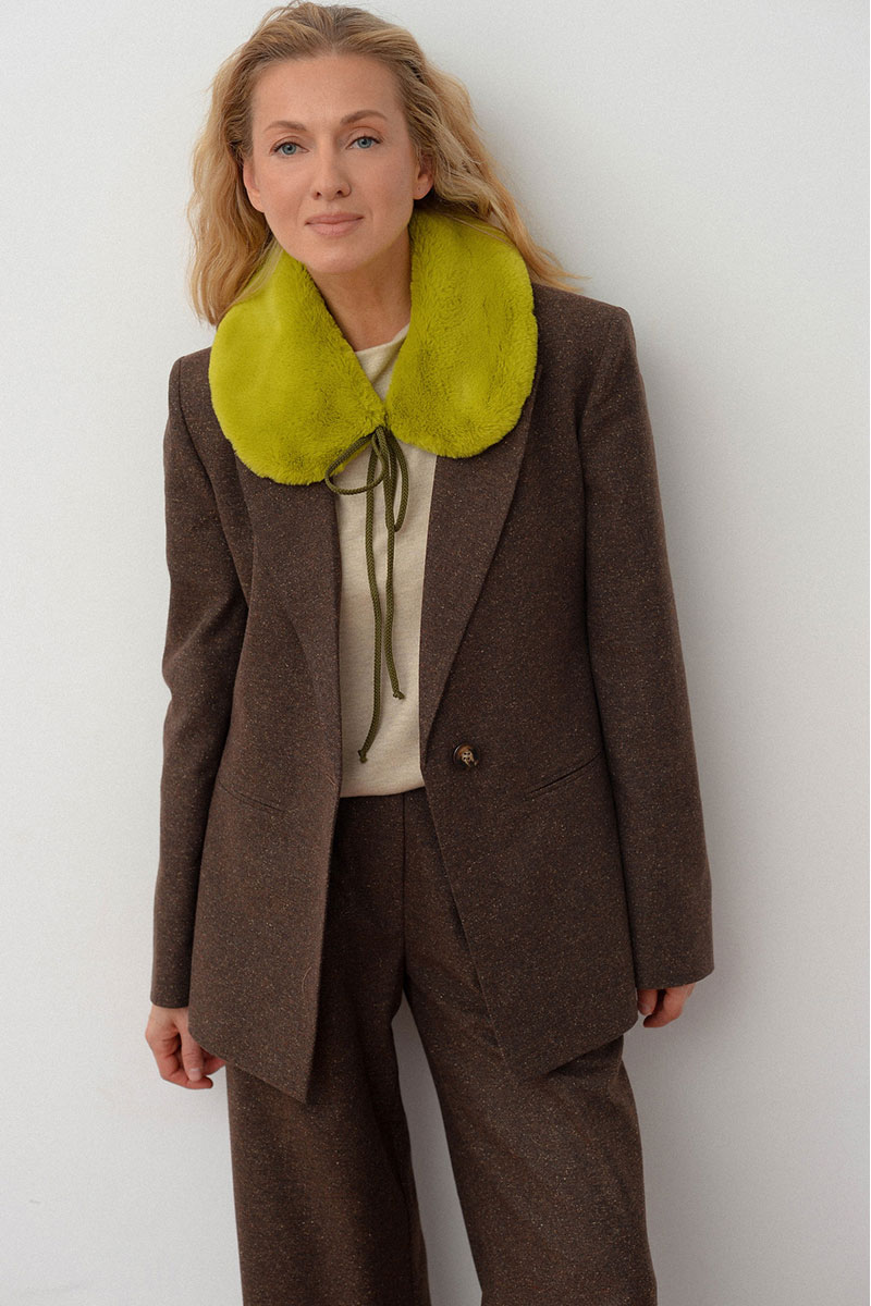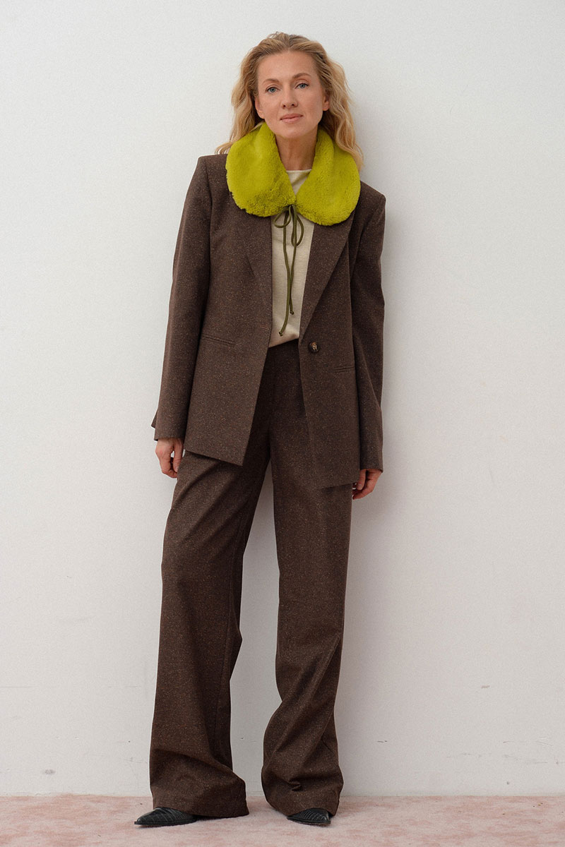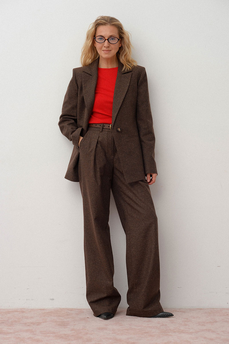 Жакет в меланжевом оттенке шоколада. Создан из премиальной итальянской шерсти с шелком. Ткань отличается своей мягкой ворсистой текстурой, отлично держит форму и сохраняет тепло. Формирует идеальный силуэт благодаря сочетанию плавных линий и акценту на талии, позволяет подчеркнуть фигуру. Благодаря комфортному подкладу из твила, изделие приятно ощущается на теле и удобно надевается поверх других вещей. Два прорезных кармана, застегивается на одну пуговицу. Идеально сочетается с костюмными брюками из нашей коллекции.
