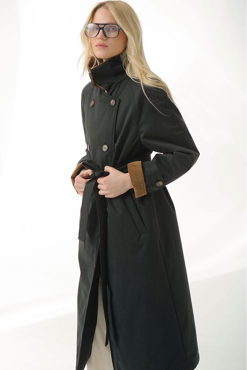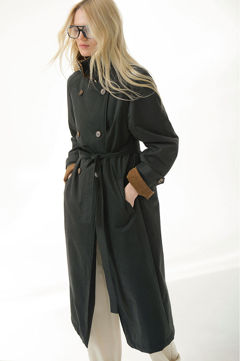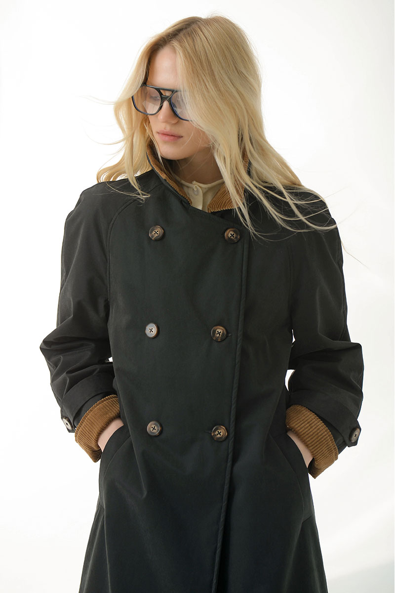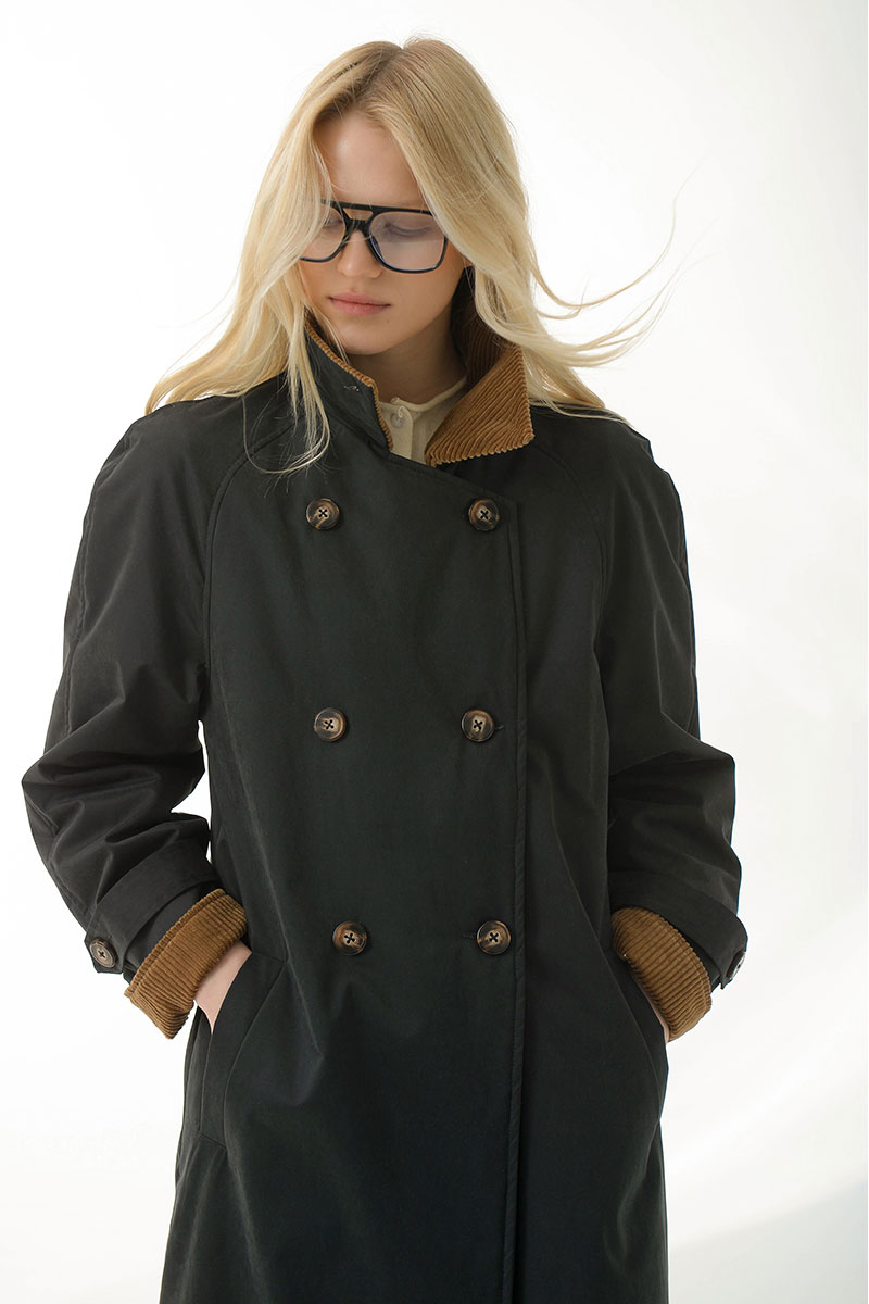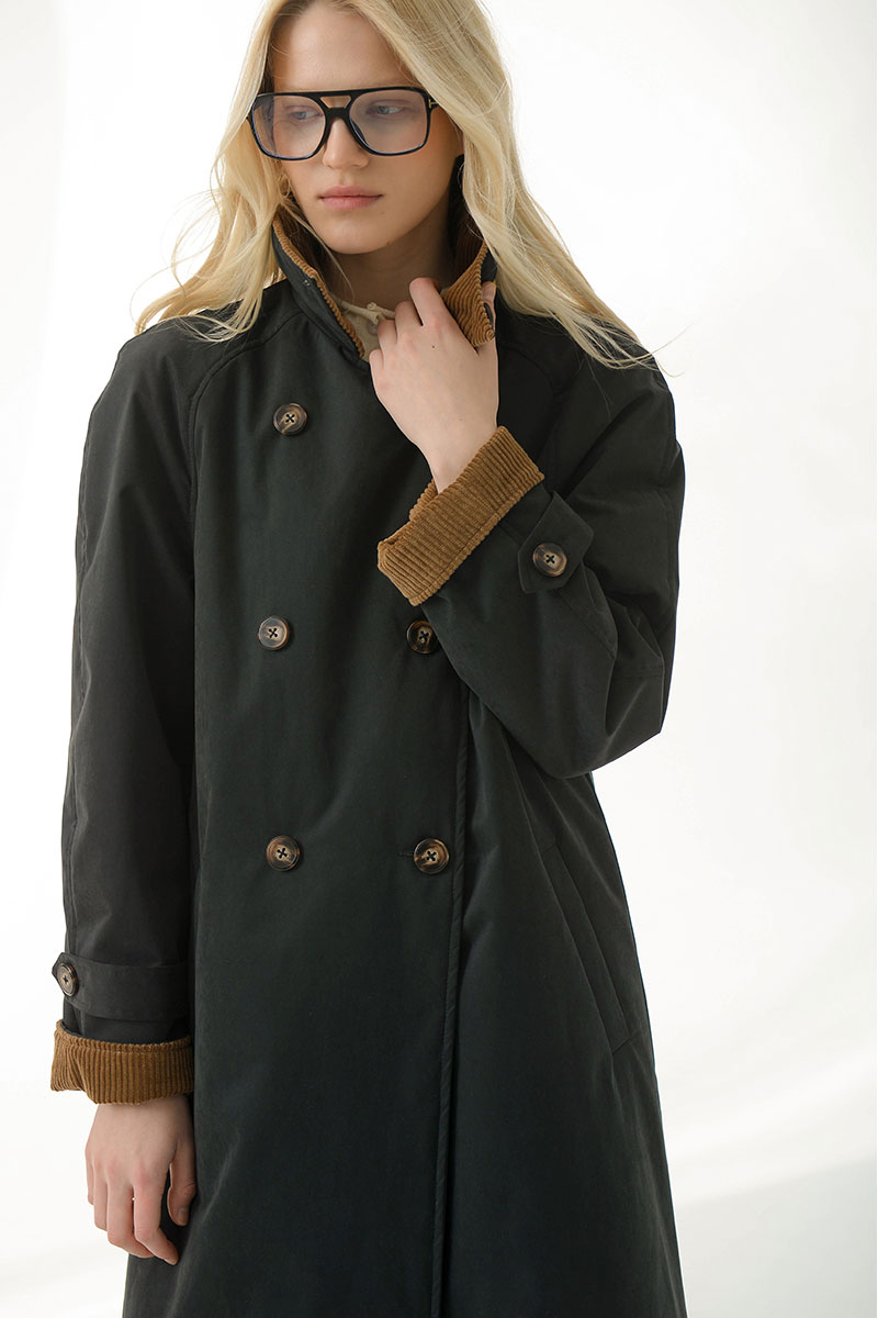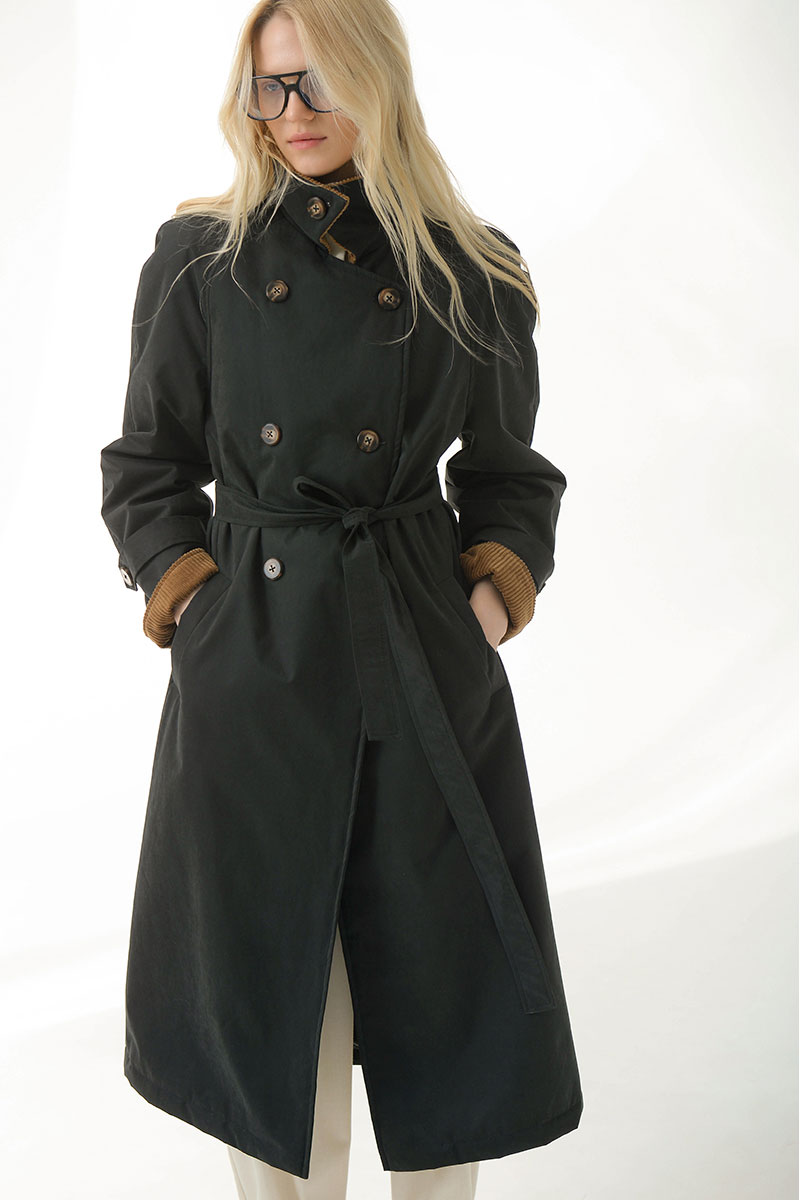 внутренний функциональный карман.Высокий воротник можно зафиксировать пуговицей, а талию — подчеркнуть поясом. Верхняя ткань в контрасте с бархатистой текстурой вельвета добавляет
