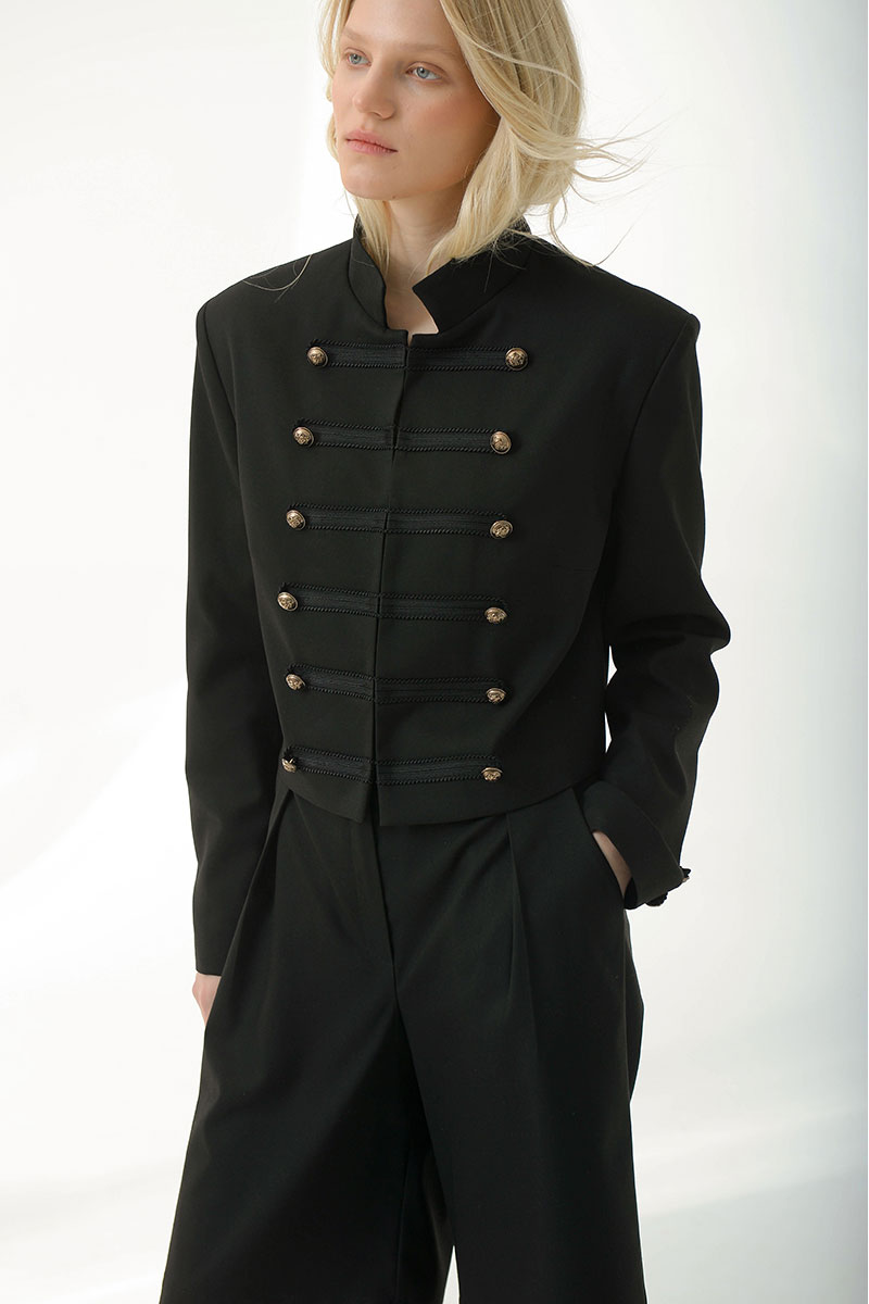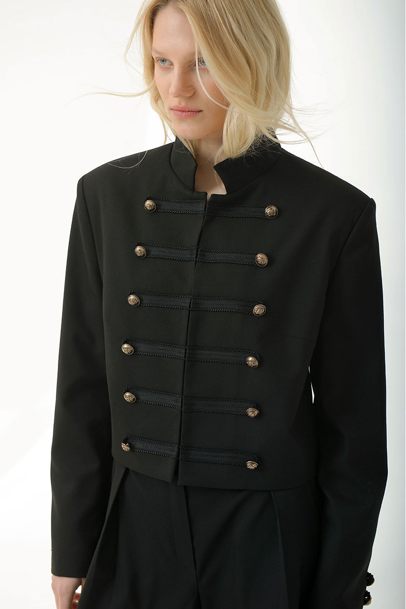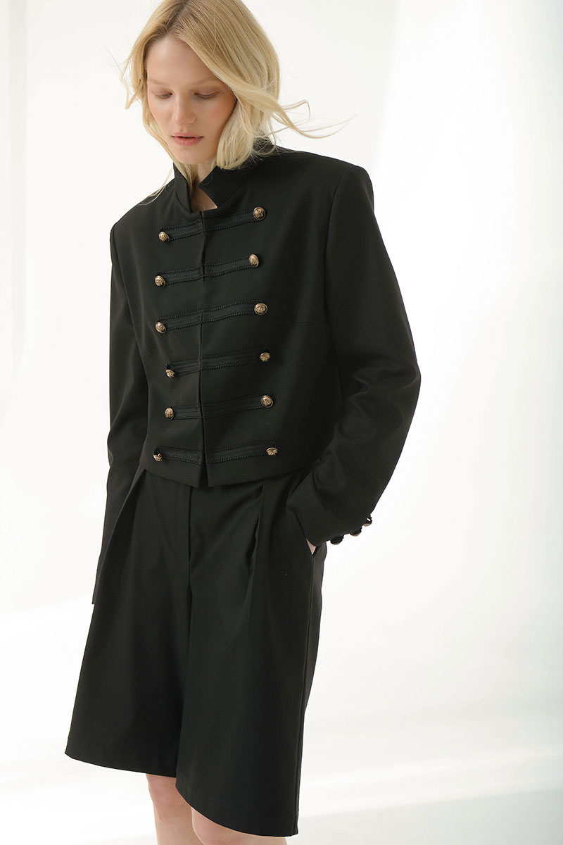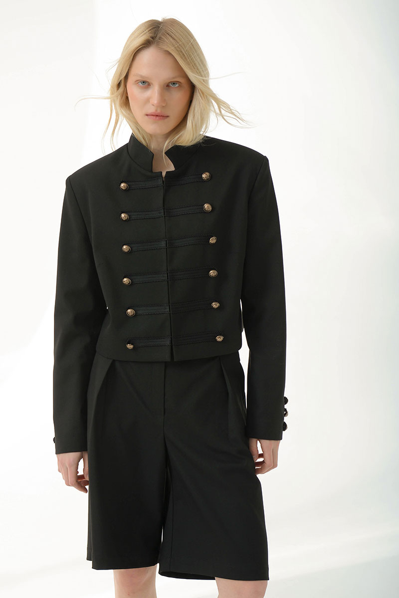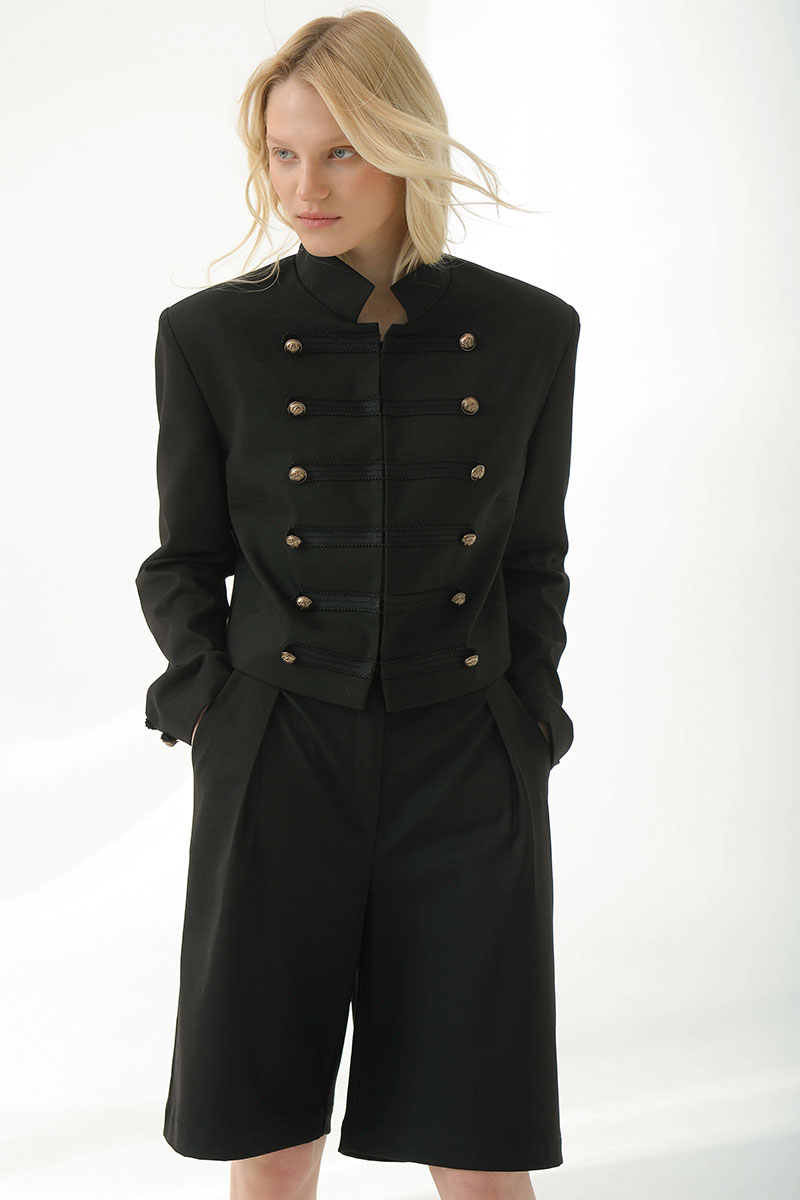 Укороченный жакет в стиле милитари придает структуру и уверенность.Выполнен из плотной костюмной ткани, хорошо держит форму,комфортная подкладка из поливискозы. Украшен декоративной тесьмой и дополнен матовыми мелалическими пуговицами. Воротник-стойка,застежка на крючки. Идеально сочетается с шортами и брюками из нашей коллекции.