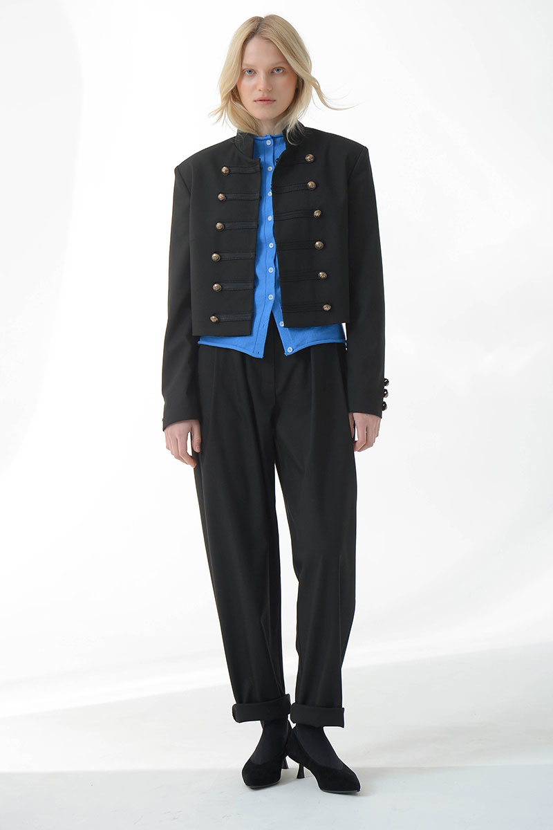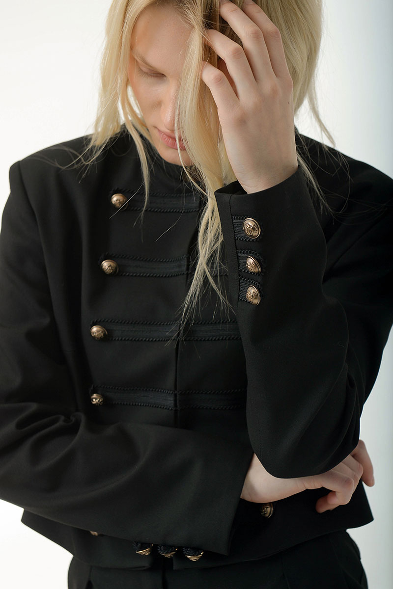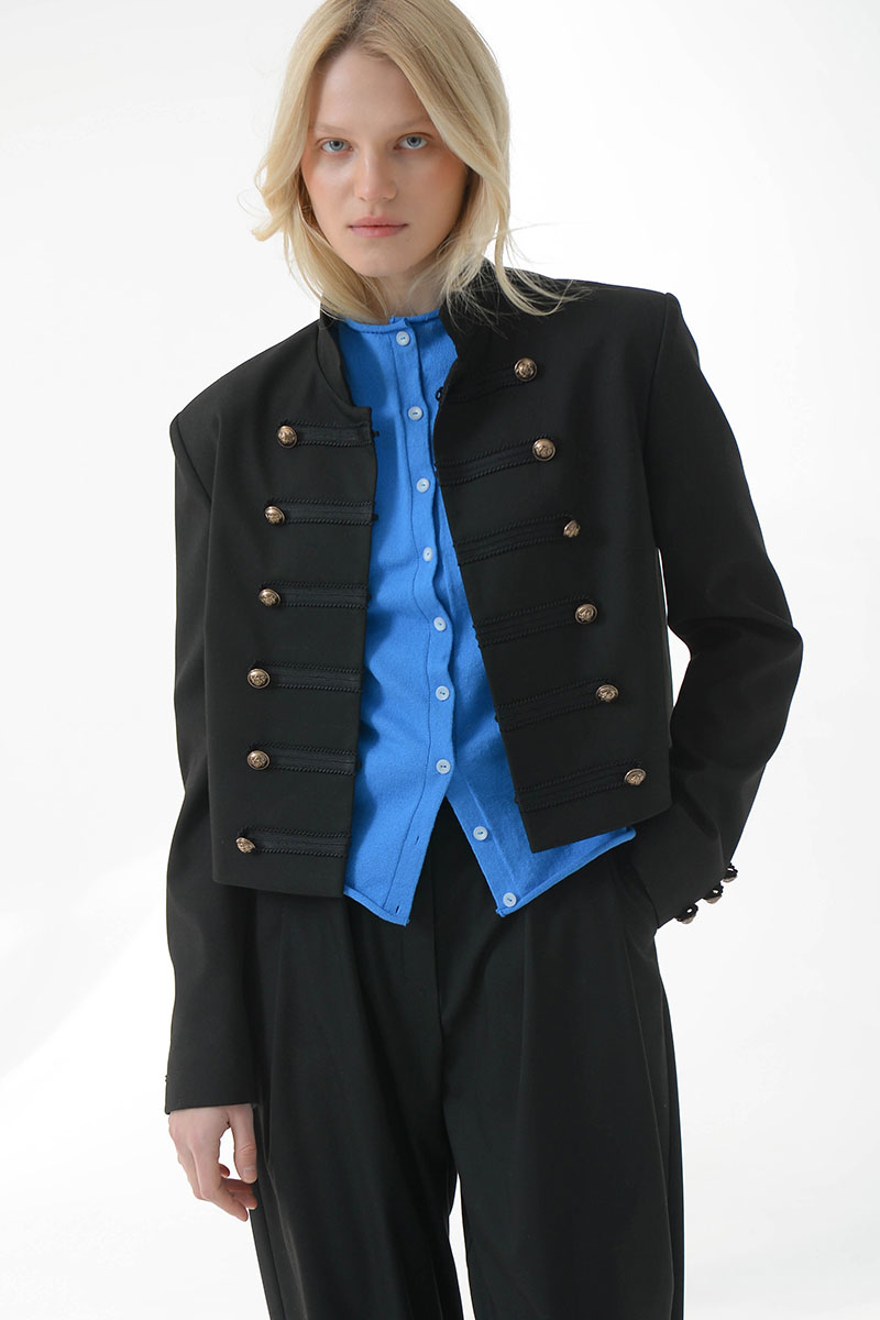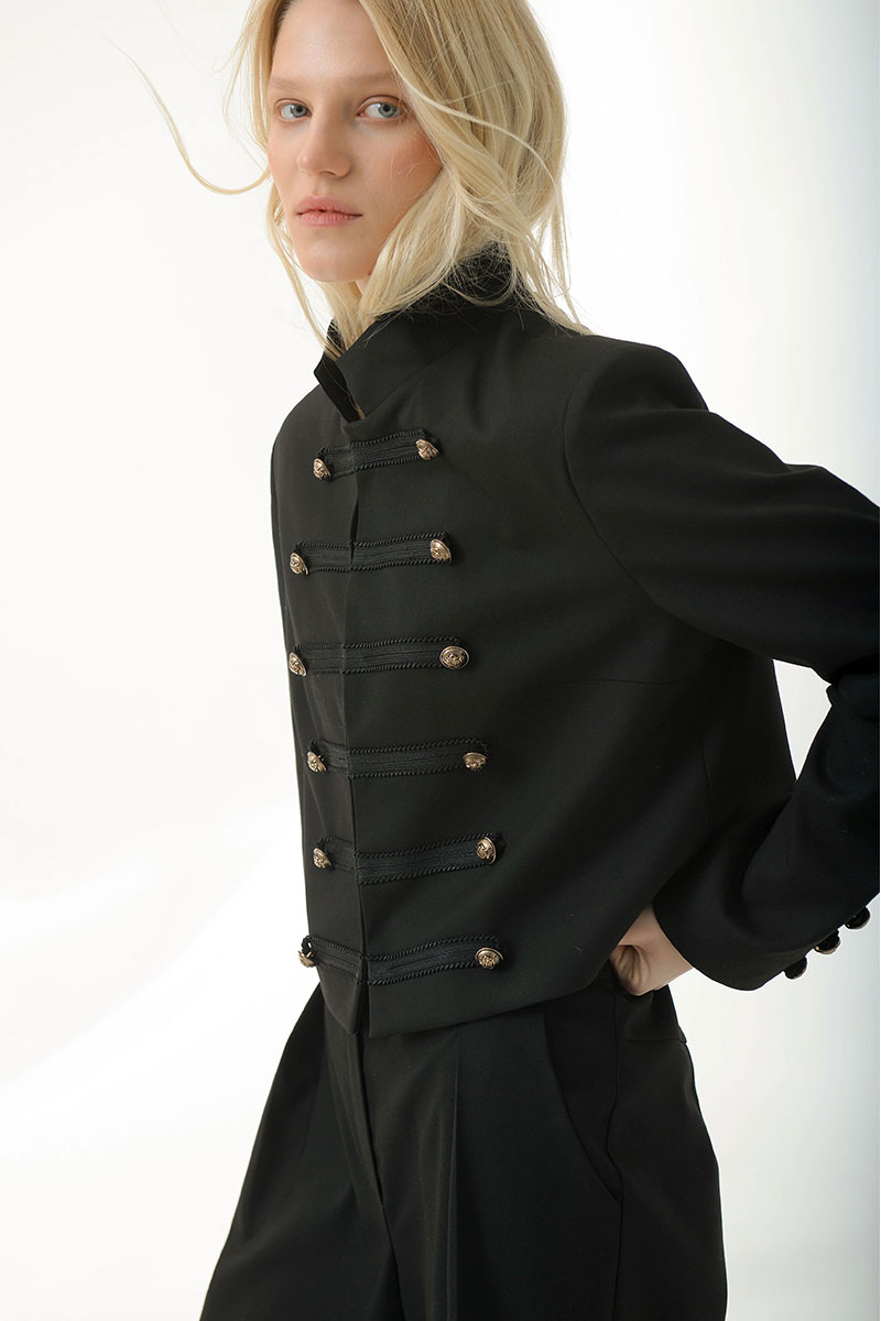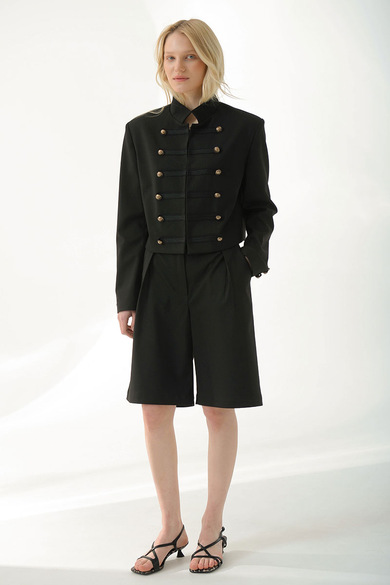 Укороченный жакет в стиле милитари придает структуру и уверенность.Выполнен из плотной костюмной ткани, хорошо держит форму,комфортная подкладка из поливискозы. Украшен декоративной тесьмой и дополнен матовыми мелалическими пуговицами. Воротник-стойка,застежка на крючки. Идеально сочетается с шортами и брюками из нашей коллекции.