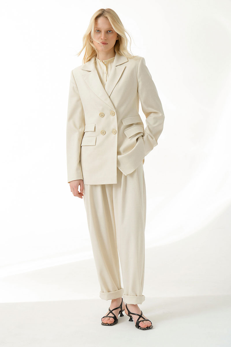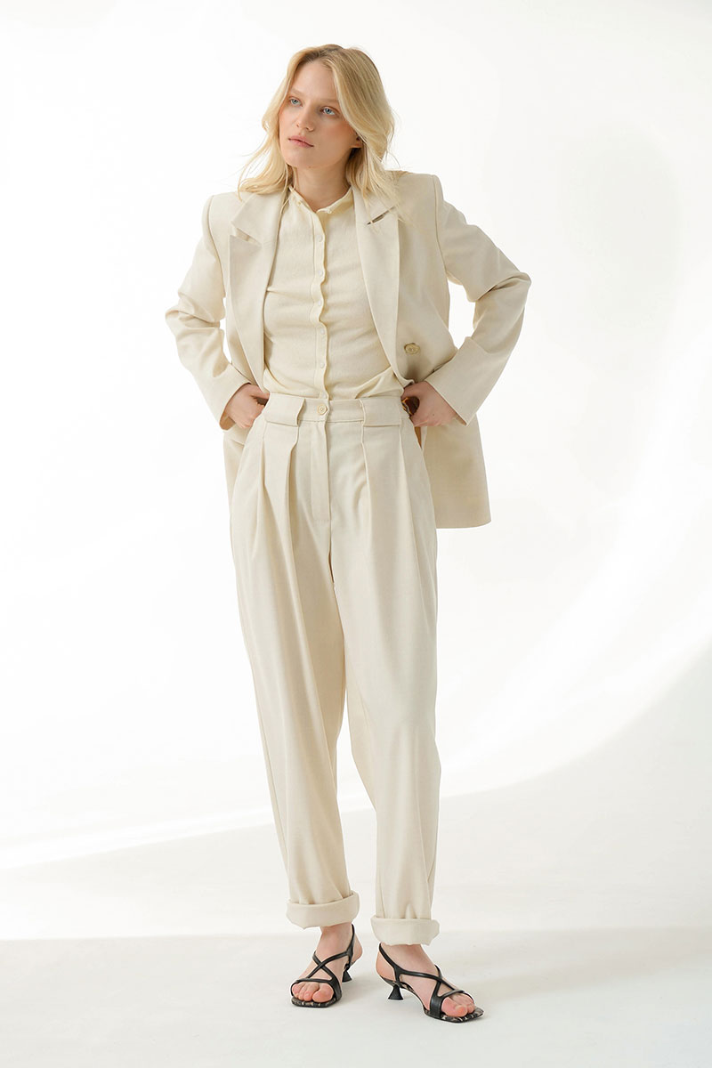 Брюки в кремовом оттенке. Комфортные и расслабленные,чуть зауженные к низу ,создают женственный силуэт и не стесняют движений. Созданы из мягкой, матовой,чуть ворсистой, приятной на ощупь ткани, которая плавно струится по длине. Широкие шлевки переходят в аккуратные складки спереди.Эластичный пояс(сзади стоит резинка), посадка на талии.Идеально сочетаются с полуприталенным жакетом или укороченным жакетом в стиле милитари из нашей коллекции.