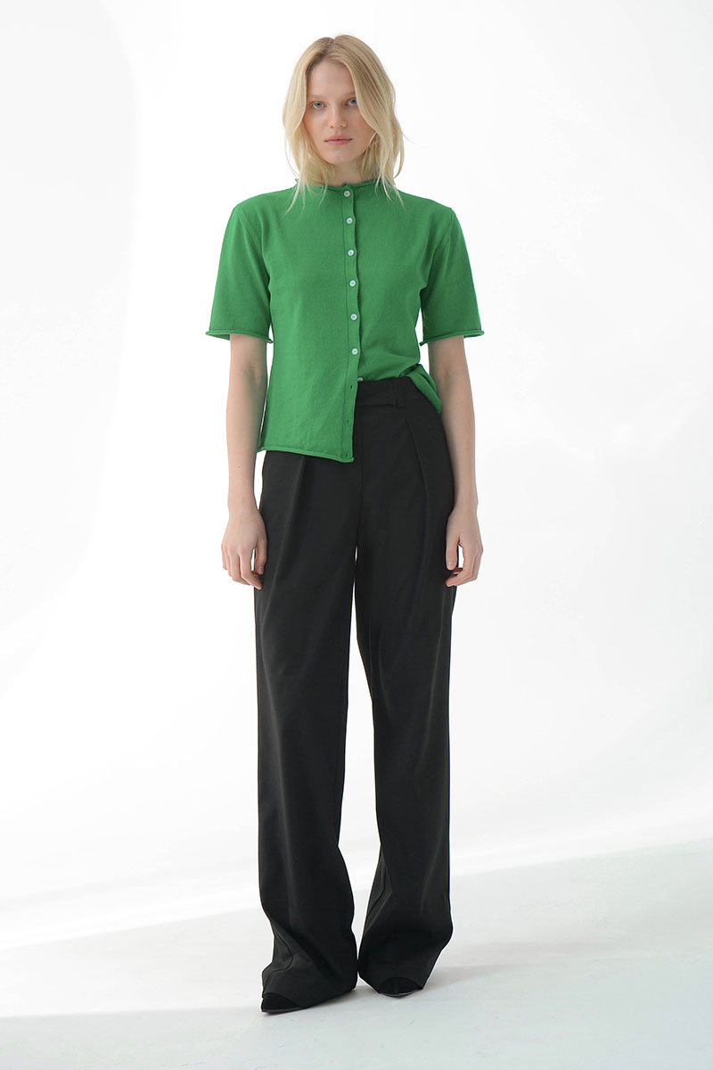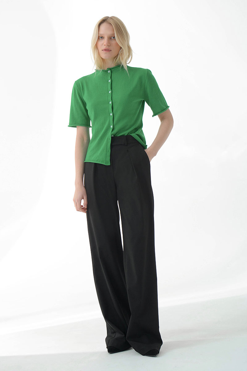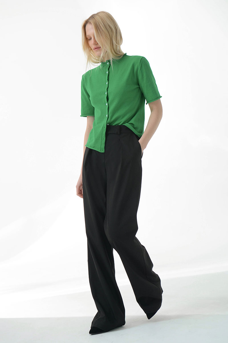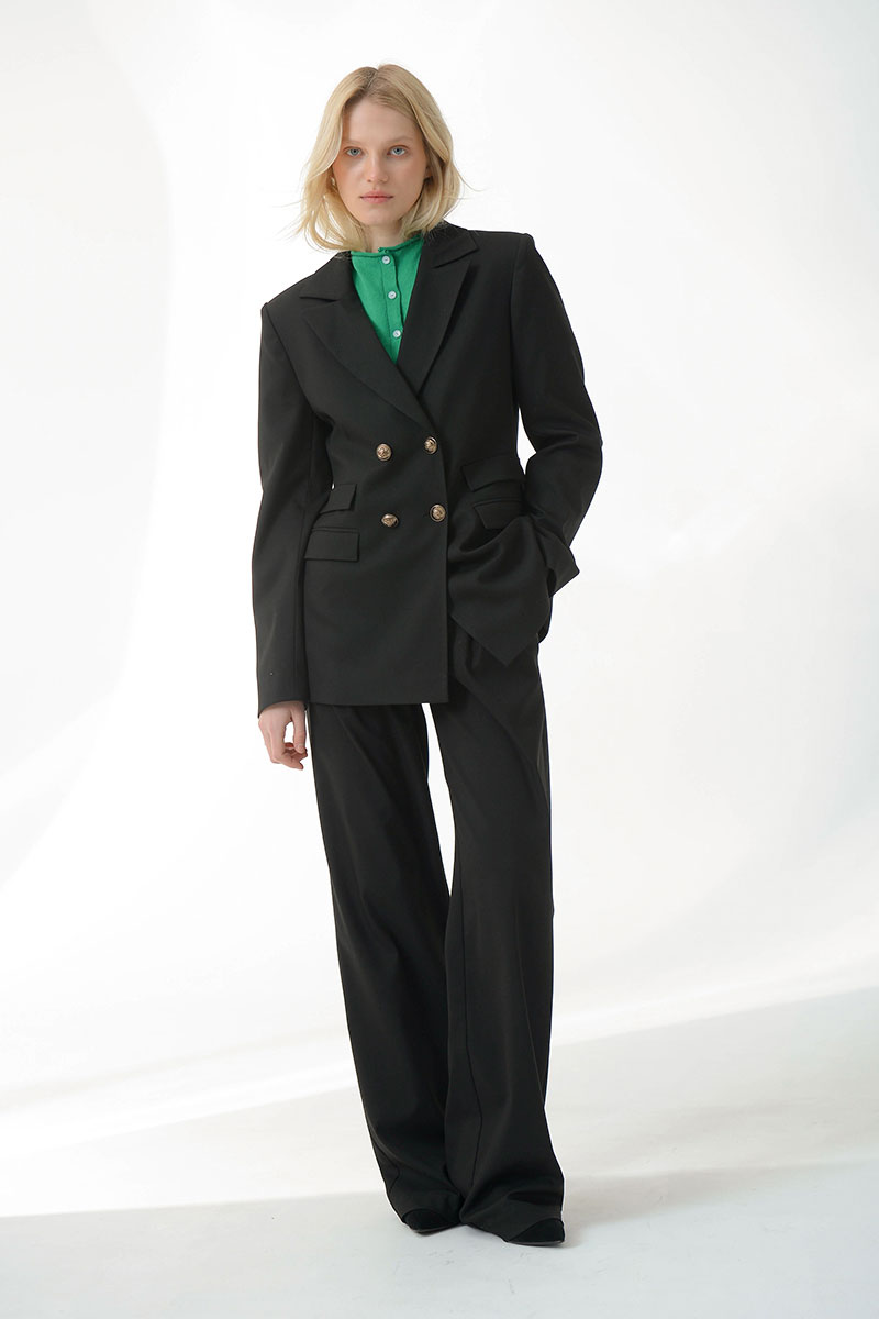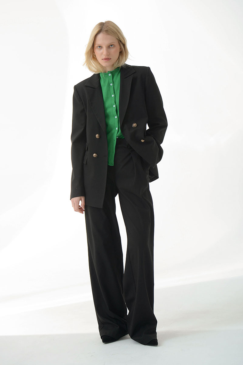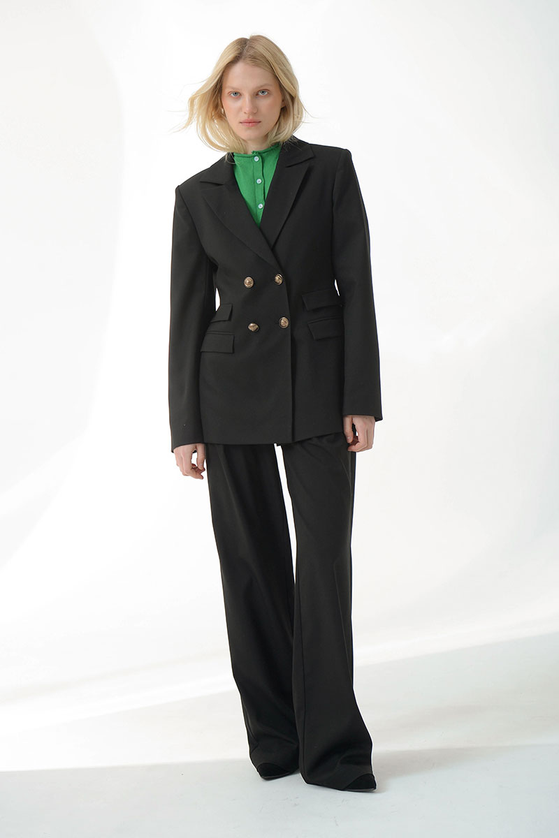 Брюки в черном цвете. Лаконичный прямой силуэт, который легко вписывается в гардероб.Выполнены из плотной дышащей ткани, которая хорошо держит форму. Изящность изделия подчеркивается тонкими защипами, плавно переходящими в аккуратные складки вдоль брючин.Конструктивная особенность изделия - закрытый пояс, застежка на крючек спрятана под специальным клапаном.Эластичный пояс(сзади стоит резинка), чтобы вы могли отрегулировать посадку. Идеально сочетаются с полуприталенным жакетом или укороченным жакетом в стиле милитари из нашей коллекции.