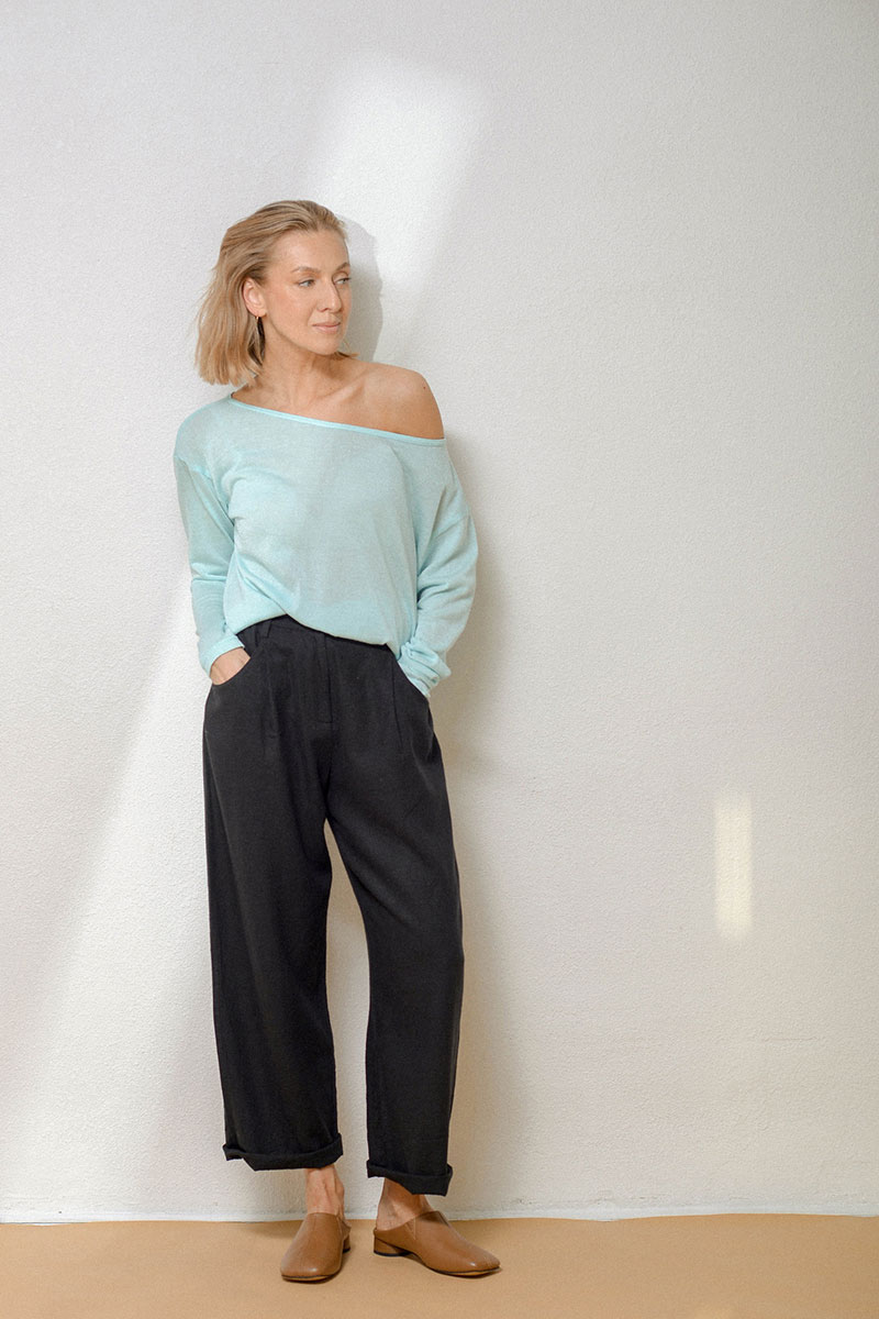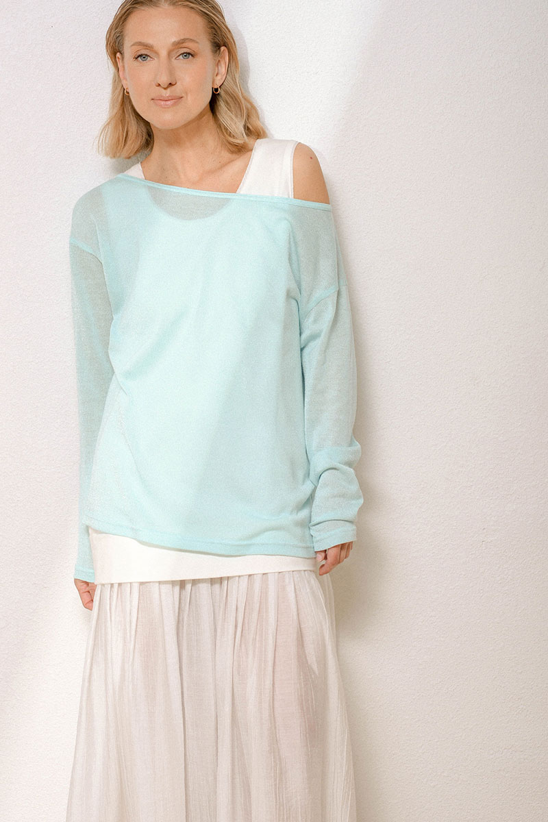 Дышащий и легкий джемпер выполнен из итальянского хлопка в нежном бирюзовом оттенке. Удобный для многослойных образов благодаря просторному удлиненному силуэту и глубокому вырезу. Мягко драпируется и деликатно поблескивает. Идеально сочетается с брюками и юбками из нашей коллекции.