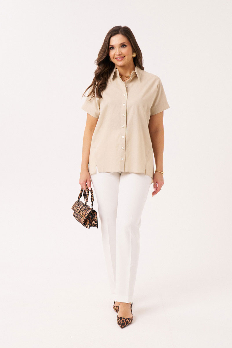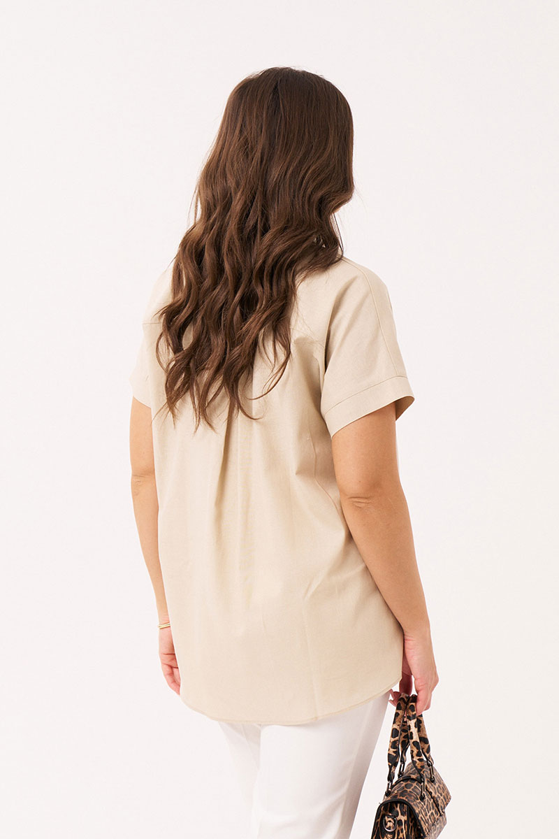 Блуза женская из льняной ткани для повседневной носки. Блуза прямого силуэта с коротким цельнокроеным рукавом. По спинке притачной волан. Горловина изделия круглая. Длина классическая.