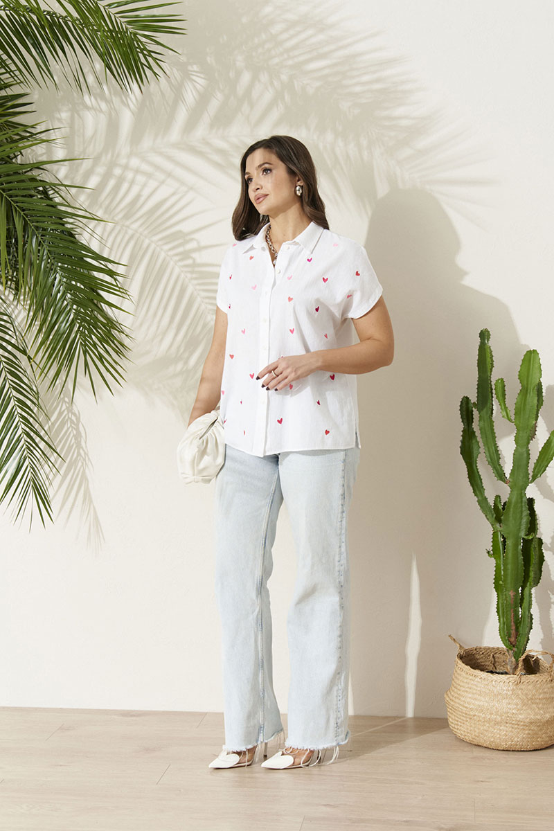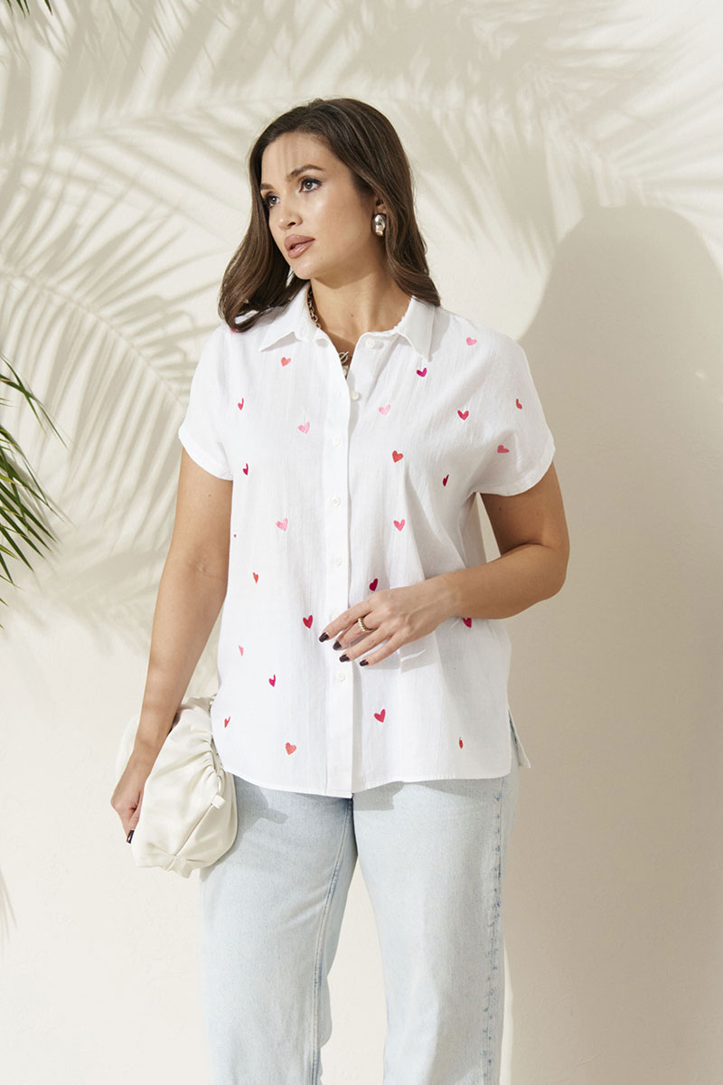Блузка женская из хлопчатобумажной ткани прямого силуэта для повседневной носки. В блузке имеется центральная бортовая застежка на шесть обметанных петель и шесть пуговиц. Перед имеет дизайнерскую вышивку в виде очаровательных сердечек. В боковых швах имеются небольшие разрезы. Горловина обработана рубашечным воротником с отрезной стойкой. Блузка с цельнокроеным коротким рукавом. Очень легкая и воздушная блузка подарит вашему телу комфорт, а также будет отлично смотреться на вашей фигуре.