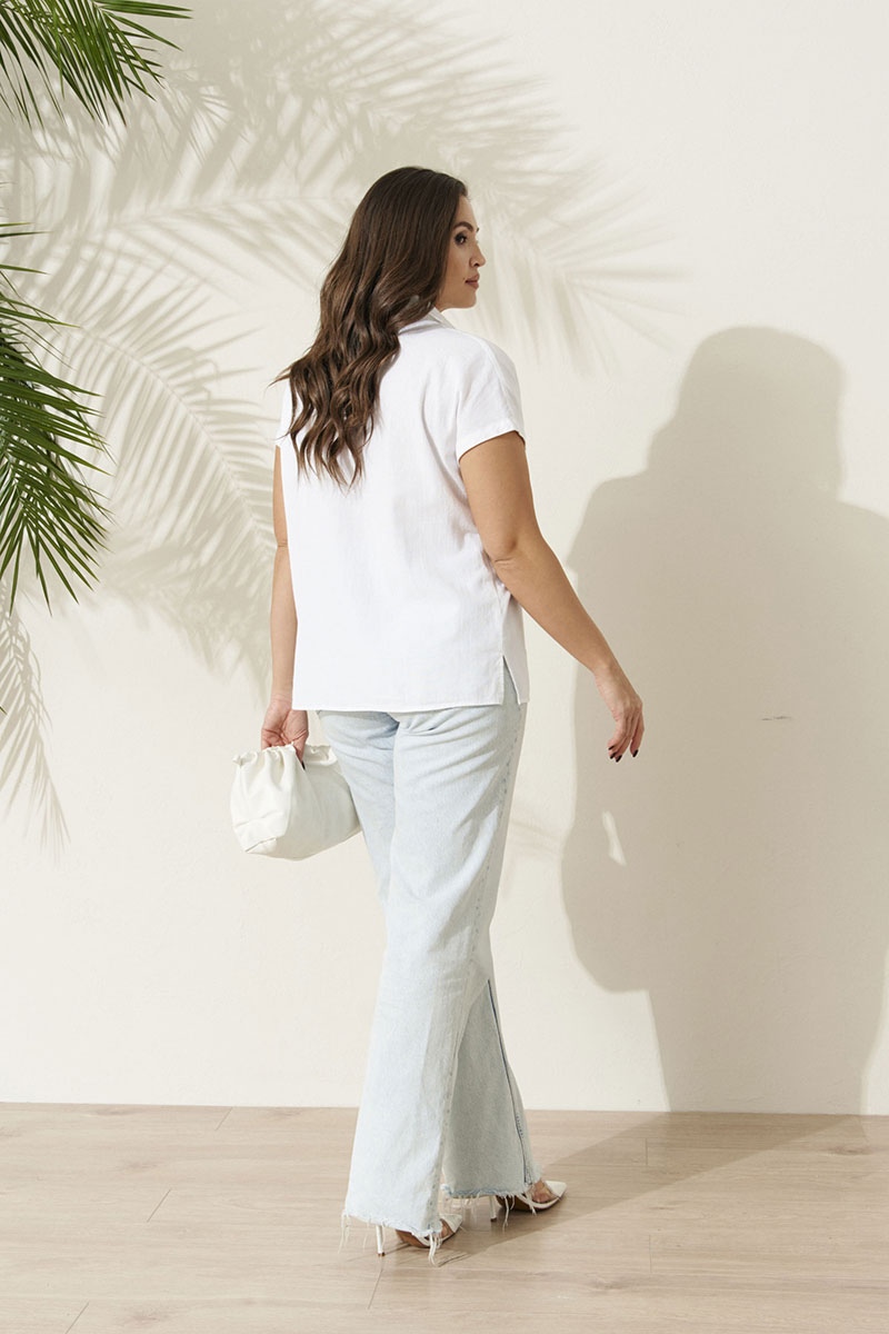 Блузка женская из хлопчатобумажной ткани прямого силуэта для повседневной носки. В блузке имеется центральная бортовая застежка на шесть обметанных петель и шесть пуговиц. Перед имеет дизайнерскую вышивку в виде очаровательных сердечек. В боковых швах имеются небольшие разрезы. Горловина обработана рубашечным воротником с отрезной стойкой. Блузка с цельнокроеным коротким рукавом. Очень легкая и воздушная блузка подарит вашему телу комфорт, а также будет отлично смотреться на вашей фигуре.