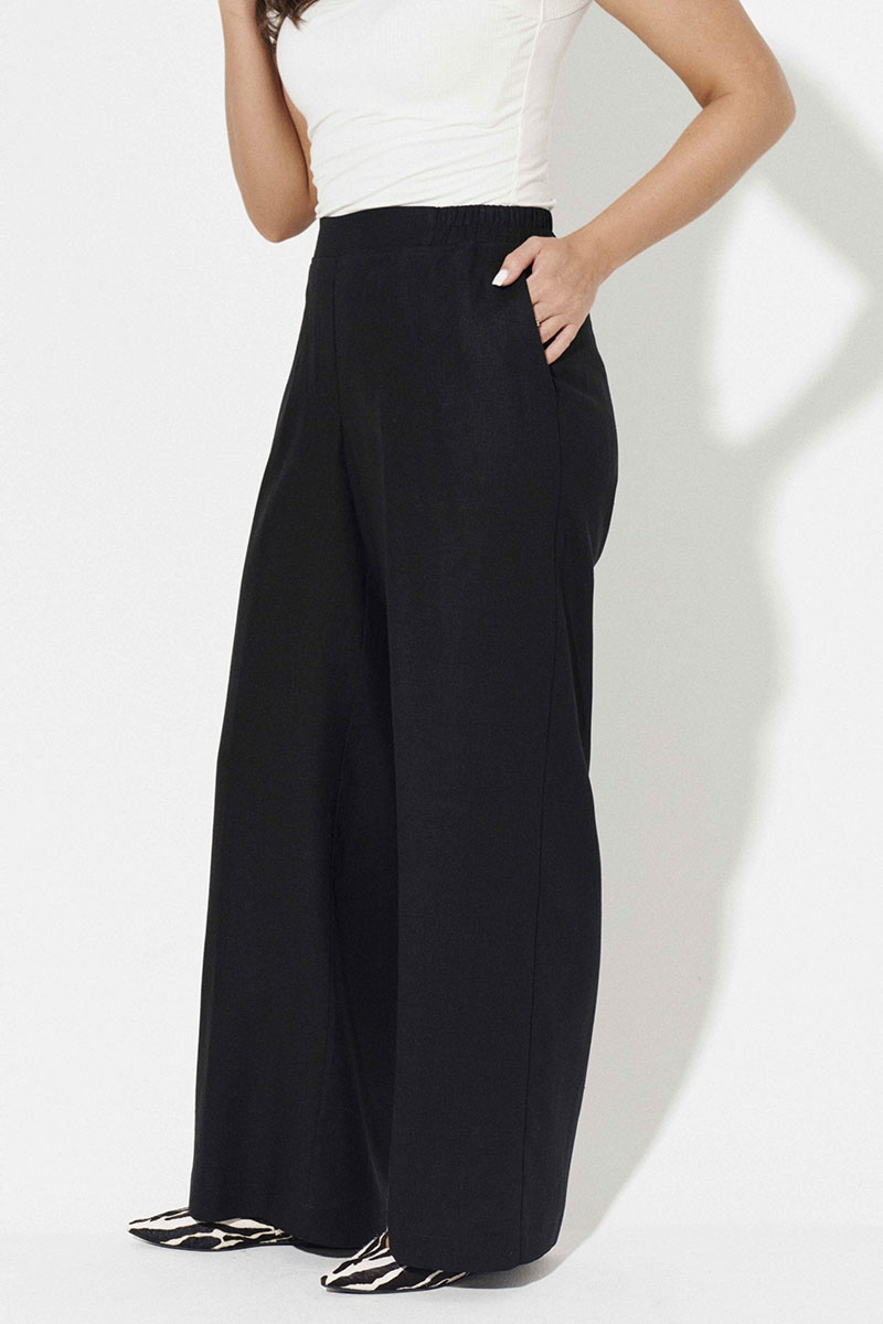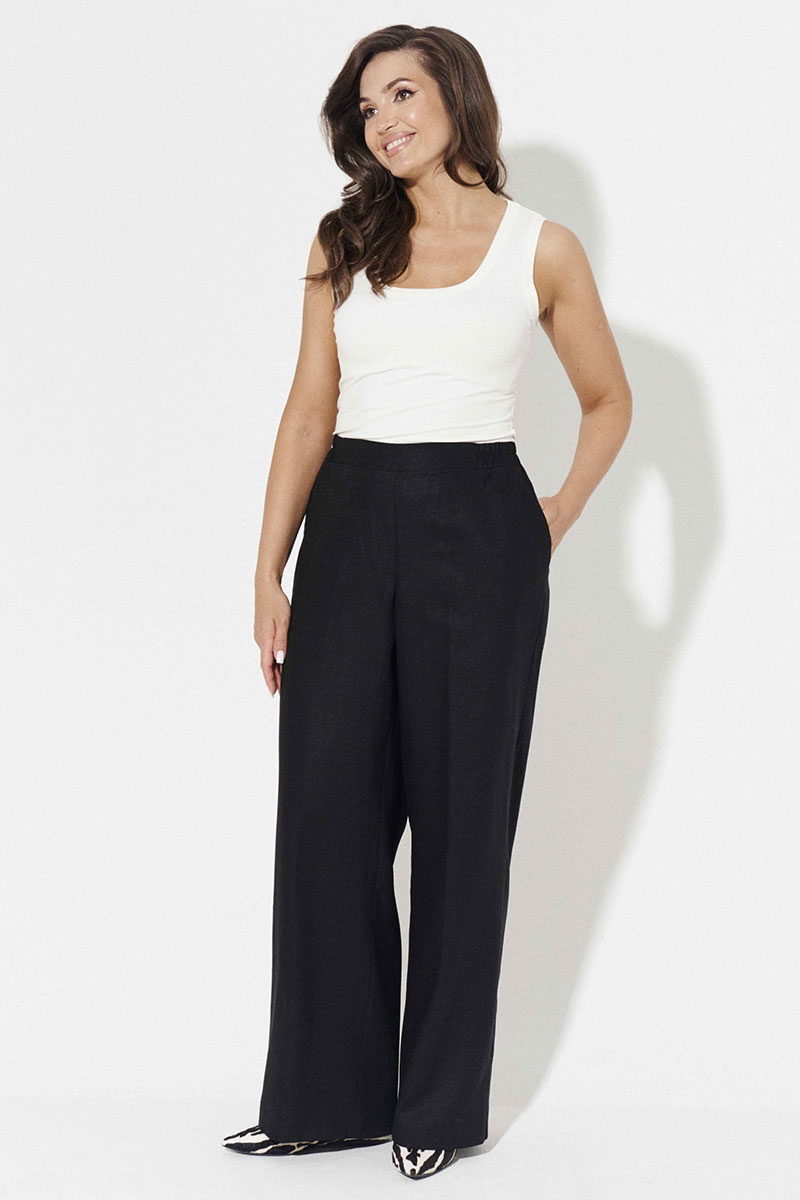 Брюки женские из поливискозной ткани с содержанием льна для повседневной носки и особых случаев. Брюки прямые. Верхний срез брюк обработан притачным поясом со вставкой на резинке, за счет чего брюки будут отлично облегать по вашей фигуре. В области боковых швов располагаются прорезные карманы. Отлично сочетается с блузками, футболками, топами, майками, жакетами. Данные брюки в черном оттенке отлично будут смотреться на вас и радовать на протяжении целого дня. Данные брюки отлично будут подходит для жарких дней. Заказывайте летние брюки больших размеров, чтобы пополнить свой сезонный гардероб практичной вещью.
