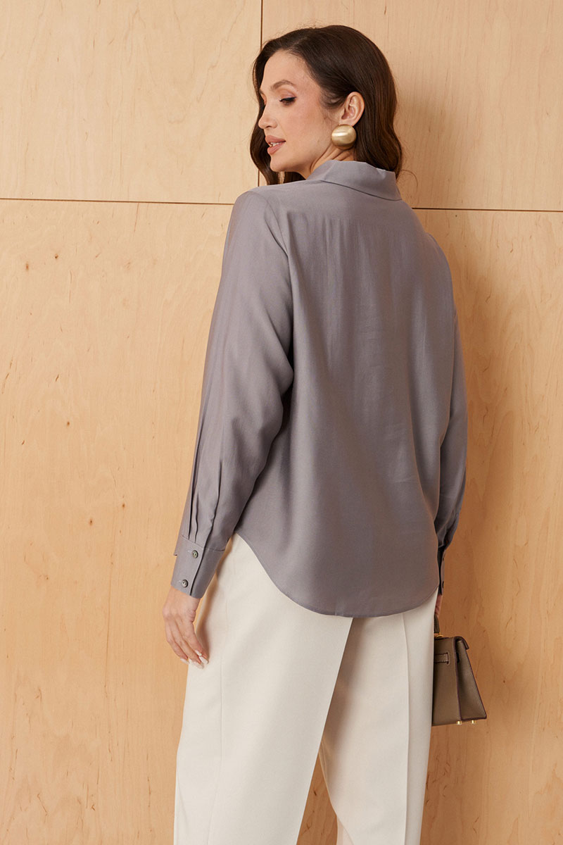 Эта стильная женская блузка идеально подойдет для повседневной носки. Выполненная в прямом силуэте, она обеспечивает комфорт и свободу движений. Ткань поливискозная, струящаяся, что придает изделию легкость и изящность. Перед украшен центральной бортовой застежкой на обметанные петли и пуговицы, а низ изделия выполнен с закругленным краем, добавляя изящества образу. Горловина оформлена классическим рубашечным воротником, а рукава завершены притачными манжетами с застежками на две обметанные петли и пуговицы — практично и стильно. Эта очень легкая и практичная блузка станет отличным выбором для ежедневных образов, сочетая комфорт с элегантностью и привлекательностью.