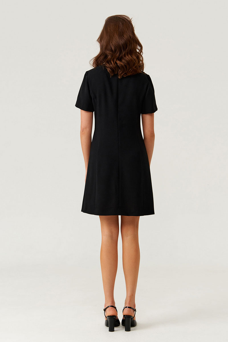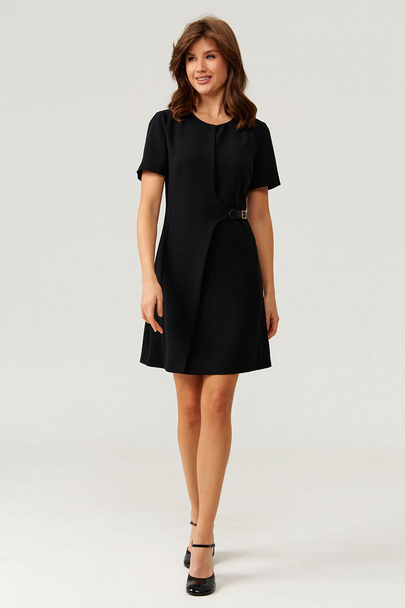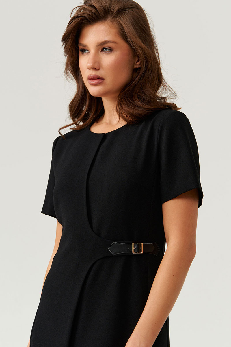 Это женское платье из легкой, струящейся ткани, идеально подходящее для повседневной носки. Модель выполнена в полуприлегающем силуэте, подчеркивающем женственную фигуру и создающем элегантный образ. Передняя часть украшена двумя нагрудными вытачками, которые придают аккуратность и объемность. Дополнительно на передней части расположена отрезная декоративная деталь в рельефе. Декоративная деталь с имитацией застежки в виде небольшого ремешка, добавляющая изюминку и стильный акцент. На переде располагается два рельефа, идущих от линии проймы до низа, что создает интересную фактуру и визуальную динамику. Спинка выполнена со средним швом и двумя рельефами, начинающимися у линии проймы и продолжающимися до низа, что обеспечивает хорошую посадку и комфорт. Застежка — потайная молния в среднем шве спинки — делает посадку более аккуратной и гладкой. Длина платья — миди, оно выполнено в классическом черном цвете, что делает его универсальным и стильным вариантом для различных случаев.