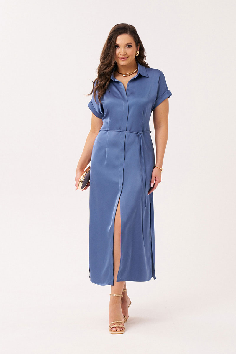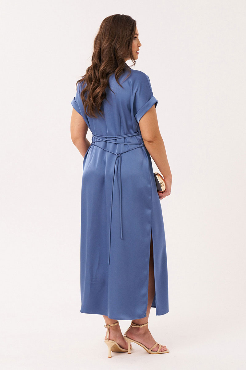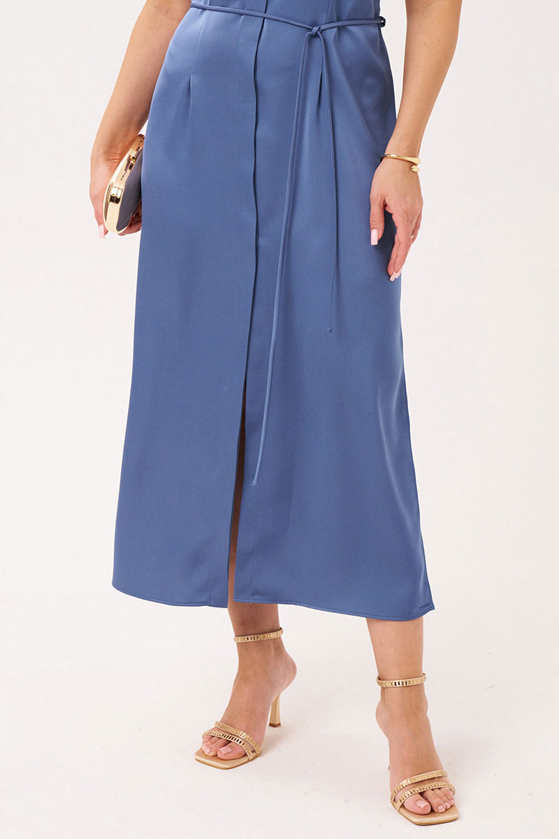 Платье женское из лёгкой струящейся ткани для торжественных случаев. Платье полуприлегающего силуэта. Перед с талиевыми вытачками. В платье имеется центральная бортовая супатная застежка на обметанные петли и пуговицы. В боковом шве имеются разрезы до низа изделия, а также в области талии располагаются петли, через которые протянута завязка для регулировки талии. Спинка с талиевыми вытачками. Горловина обработана рубашечным воротником на стойке. Рукав цельнокроеный, короткий. Линия плеча слегка спущена. Красивое и очень удобное платье, которое станет вашим фаворитом.