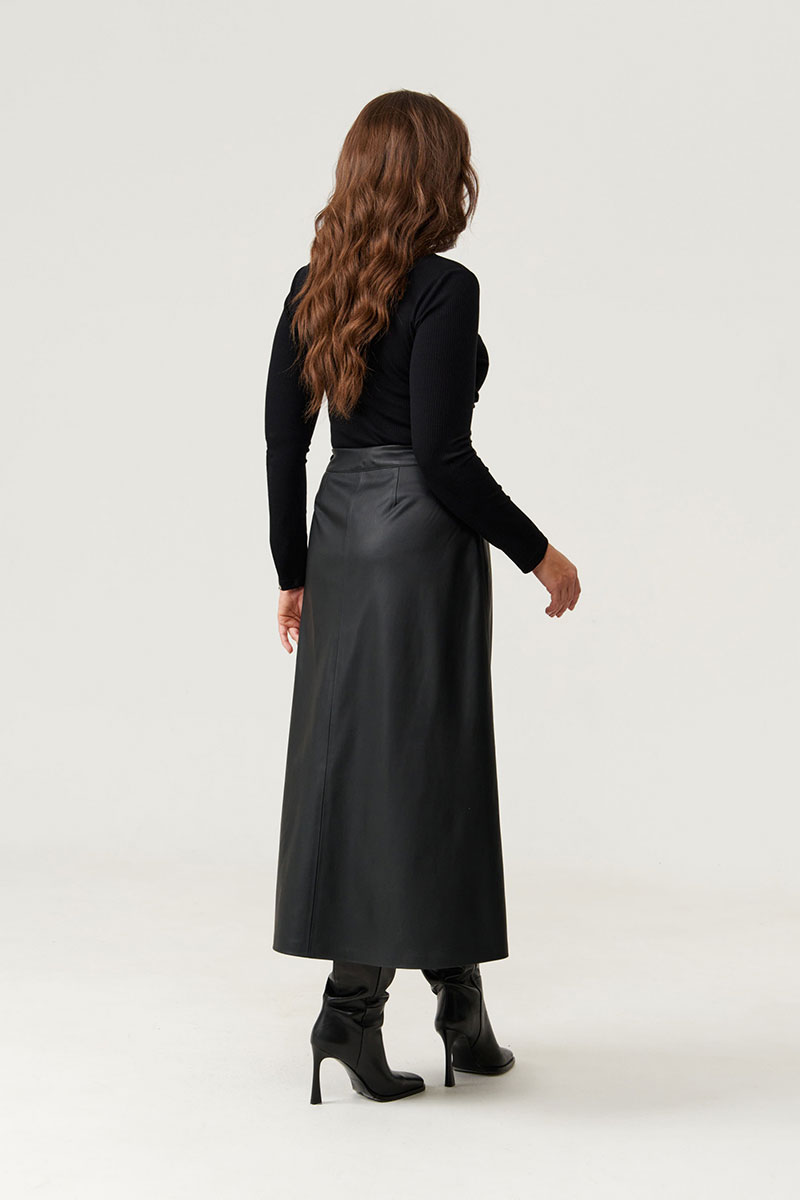 обнимающее фигуру и придающее образу легкую динамику. Глубокий черный оттенок подчеркивает изысканность материала, а гладкая кожа придает образу нотки дерзости и уверенности.