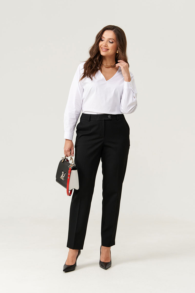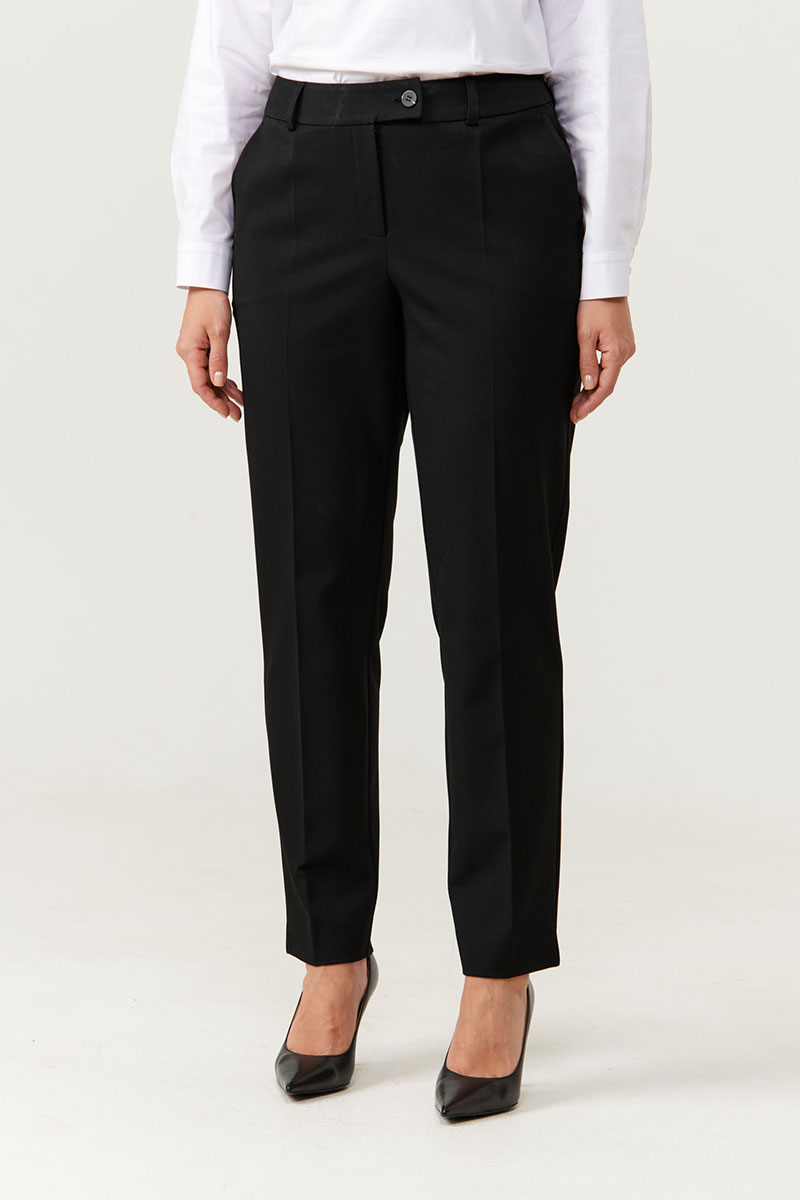 Эти женские брюки из поливискозной ткани идеально подходят для повседневной носки. Верхний срез брюк обработан притачным поясом, внутренний срез пояса украшен декоративной тесьмой, что придает изделию аккуратный и стильный вид. Застежка на одну обметанную петлю и одну пуговицу, а также имеется застёжка на тесьму-молнию в среднем шве брюк. Пояс дополнен шлёвками, позволяющими носить их с ремнём для дополнительной регулировки посадки и комфорта. Задняя часть брюк оснащена двумя талиевыми вытачками, обеспечивающими хорошую посадку по фигуре. Также имеется прорезной карман с двумя обтачками, добавляющий функциональности и эстетики. В боковых швах расположены боковые прорезные карманы с подкройным бочком, что делает эти брюки практичными для ежедневных нужд. В боковом шве имеются небольшие разрезы. Чёрный оттенок делает их универсальным элементом гардероба, сочетающим стиль и практичность.