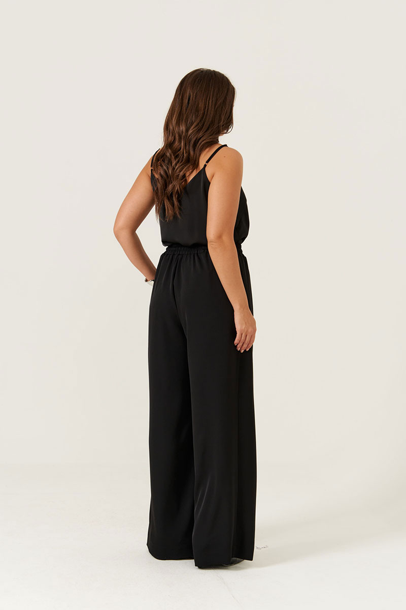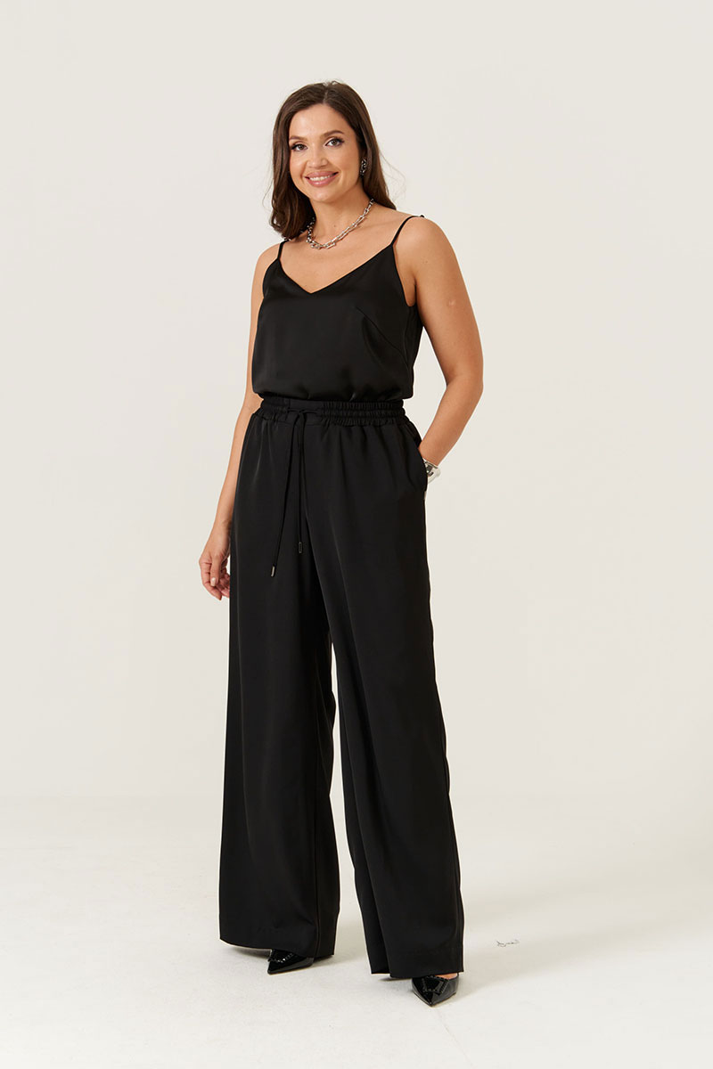 Женские прямые брюки из струящейся ткани — отличный выбор для повседневной носки. Верхний срез обработан притачным поясом с вставкой на резинке в задней и боковой части брюк, что обеспечивает комфортную посадку. Передняя частьпояса выполнена из отрезной прямой детали, придающей модели аккуратный силуэт. В пояс вставлены завязки с металлическими наконечниками, позволяющие регулировать облегание в области талии. В боковых швах расположены потайные карманы для удобства и практичности. Благодаря качественному составу ткани брюки не мнутся, что делает их особенно удобными в носке. Модные и универсальные черные брюки станут базовым элементом вашего гардероба, сочетаясь с различными образами и стилями.