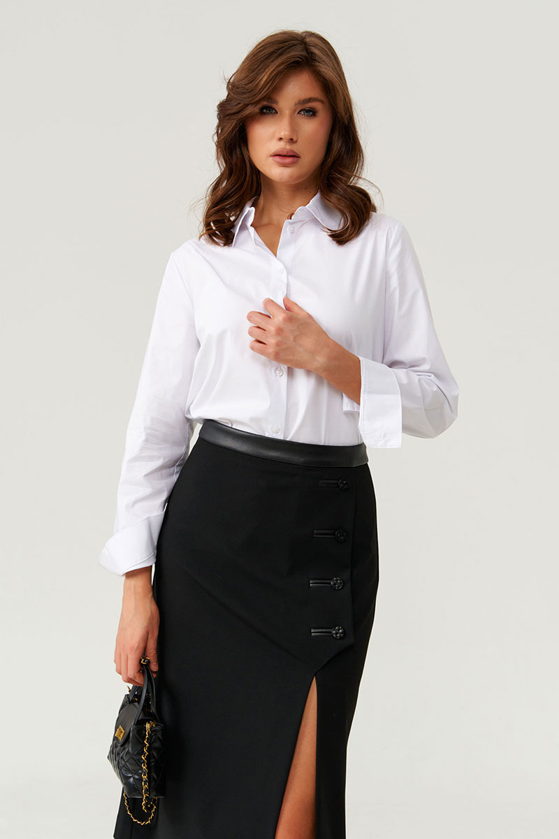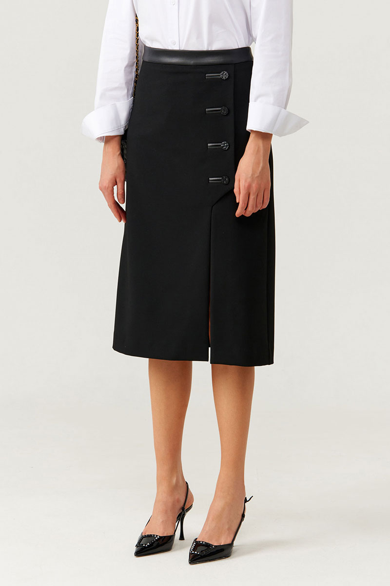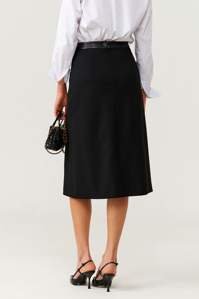 Женская юбка прямого силуэта из поливискозной ткани, идеально подходящая для повседневной носки. Верхний срез юбки оформлен притачным поясом с кожаной вставкой, внутренний край