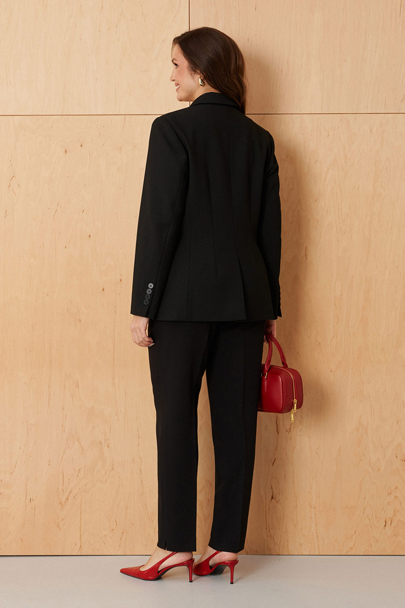 Спинка оформлена средним швом с шлицей, а также имеет две талиевые вытачки для более хорошей посадки. Горловина обработана пиджачным воротником, придающим образу классическую
