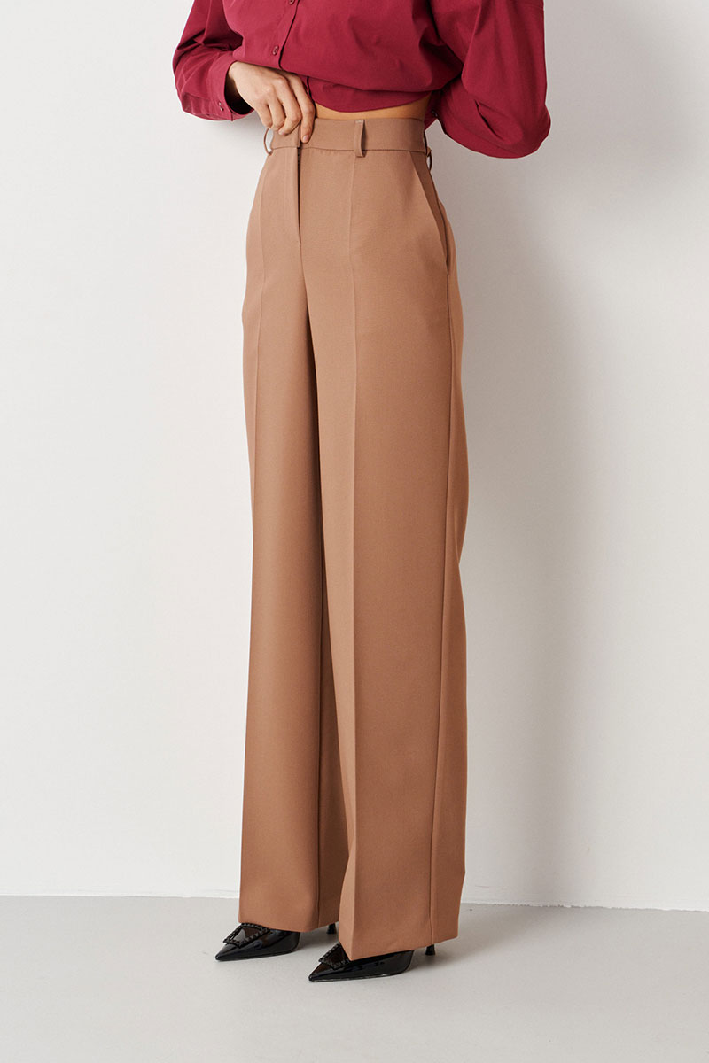 Эти женские брюки выполнены из костюмной поливискозной ткани, идеально подходящей для повседневных образов. Их классический крой и нейтральный оттенок делают их универсальным