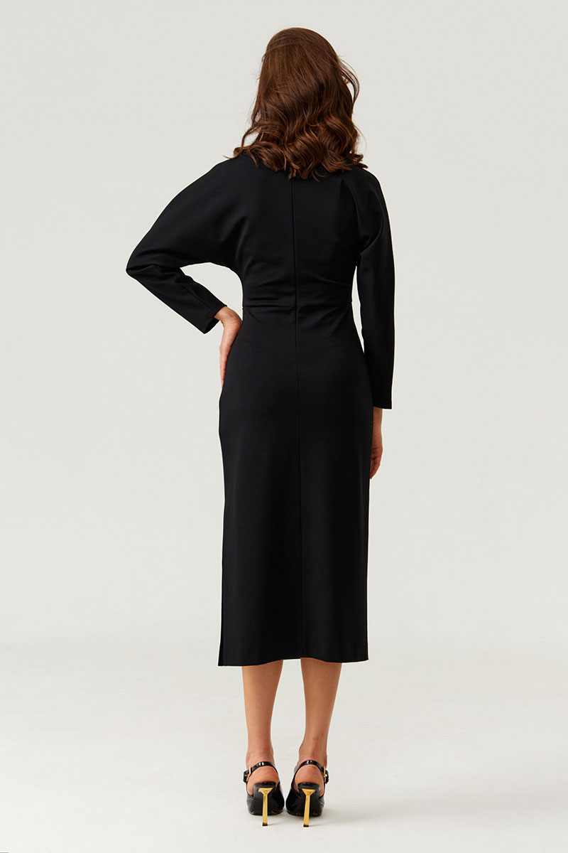 Женское платье из поливискозной ткани идеально подойдет для повседневной носки. Модель отрезная по линии талии, что создает аккуратный и женственный силуэт. На переднем полотнище в боковом шве расположены защипы и разрез, добавляющие образу изящества и удобства. Спинка выполнена со средним швом и оснащена потайной застежкой-молнией в шве для комфортного надевания. Длинные цельнокроеные рукава обеспечивают дополнительный комфорт и стильный вид. Длина платья — макси, оно выполнено в классическом черном оттенке, что делает его универсальным и легко сочетаемым с различными аксессуарами и обувью.