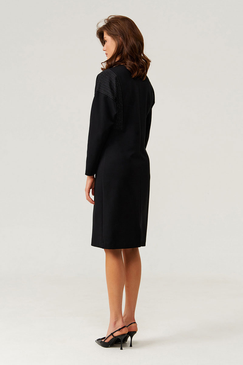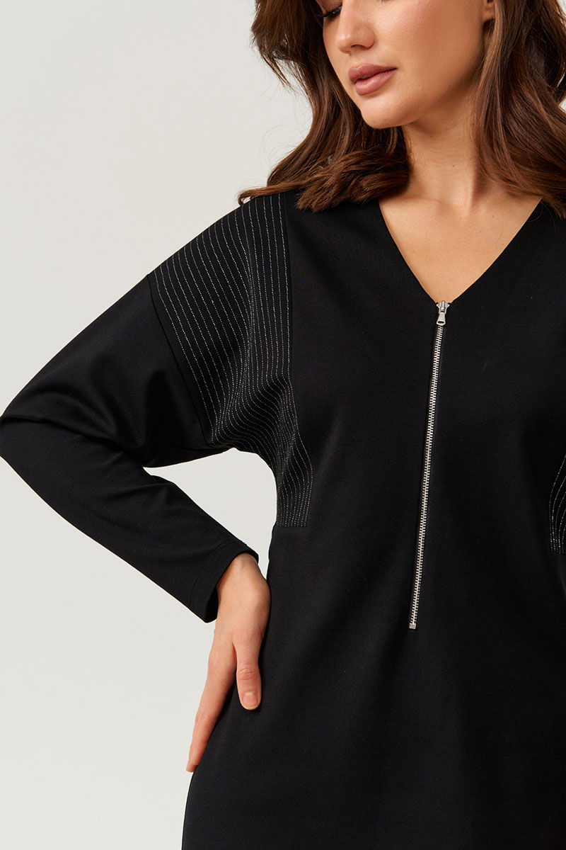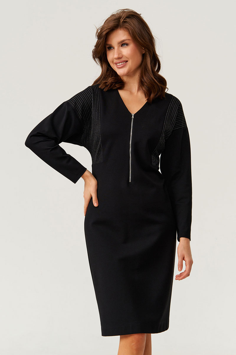 Это женское платье из поливискозной ткани, предназначенное для повседневной носки. Модель выполнена в полуприлегающем силуэте, подчеркивающем женственную фигуру и создающем комфортный образ. Передняя часть украшена боковой вставкой с декоративными блестящими полосками, которые придают изделию яркий и стильный акцент. На передней части расположена молния, идущая от горловины и доходящая чуть ниже линии талии, что обеспечивает удобство при надевании и снятии платья. Боковой шов смещен на перед, добавляя оригинальности к крою. Спинка выполнена со средним швом и также украшена боковой частью с блестящими полосками, гармонично дополняя дизайн. Вырез горловины — V-образный, линия плеча спущенная, что создает легкий и свободный силуэт. Длинные втачные рукава завершаются аккуратным швом, обеспечивая комфорт и стильность. Это универсальное платье чёрного оттенка отлично подойдет для повседневных образов с яркими акцентами.
