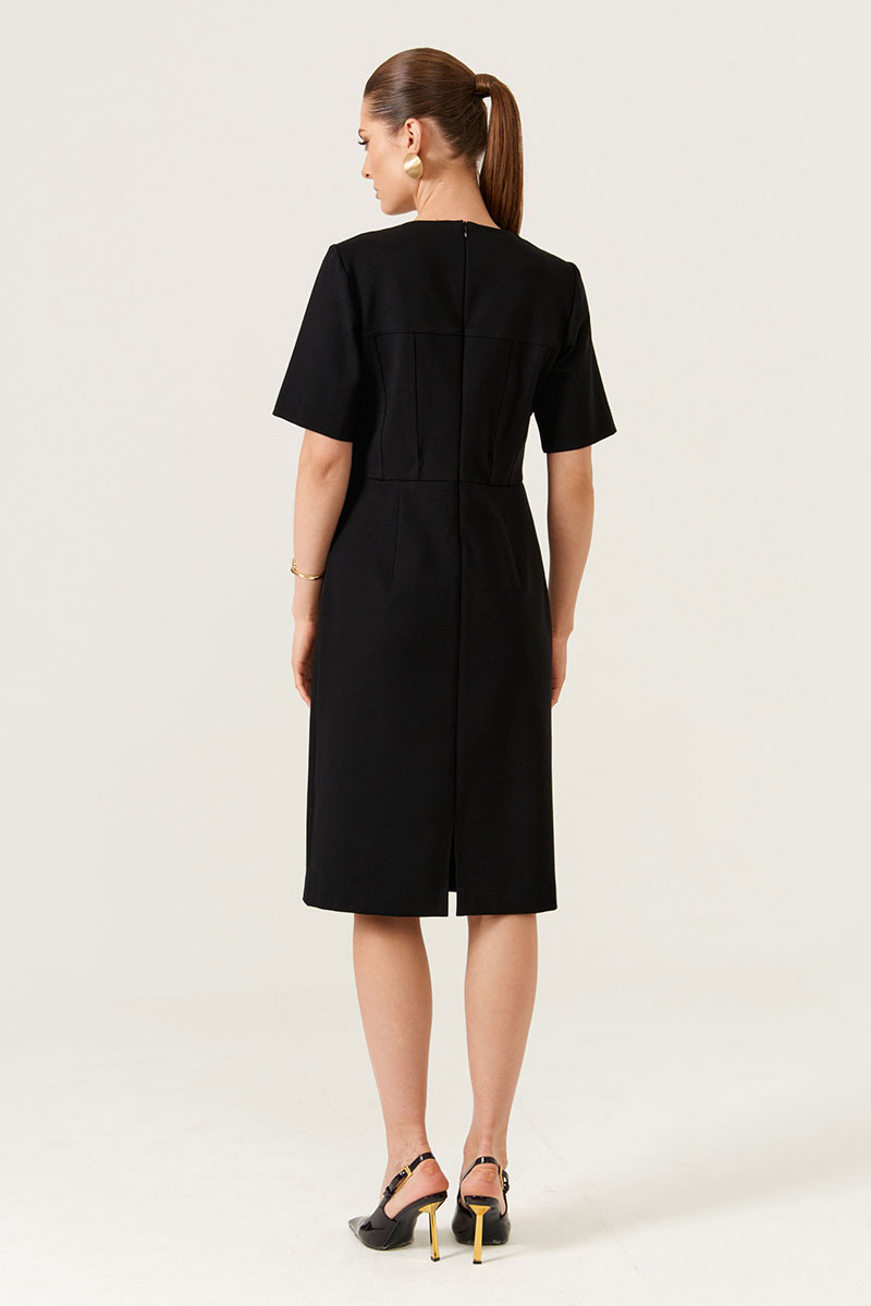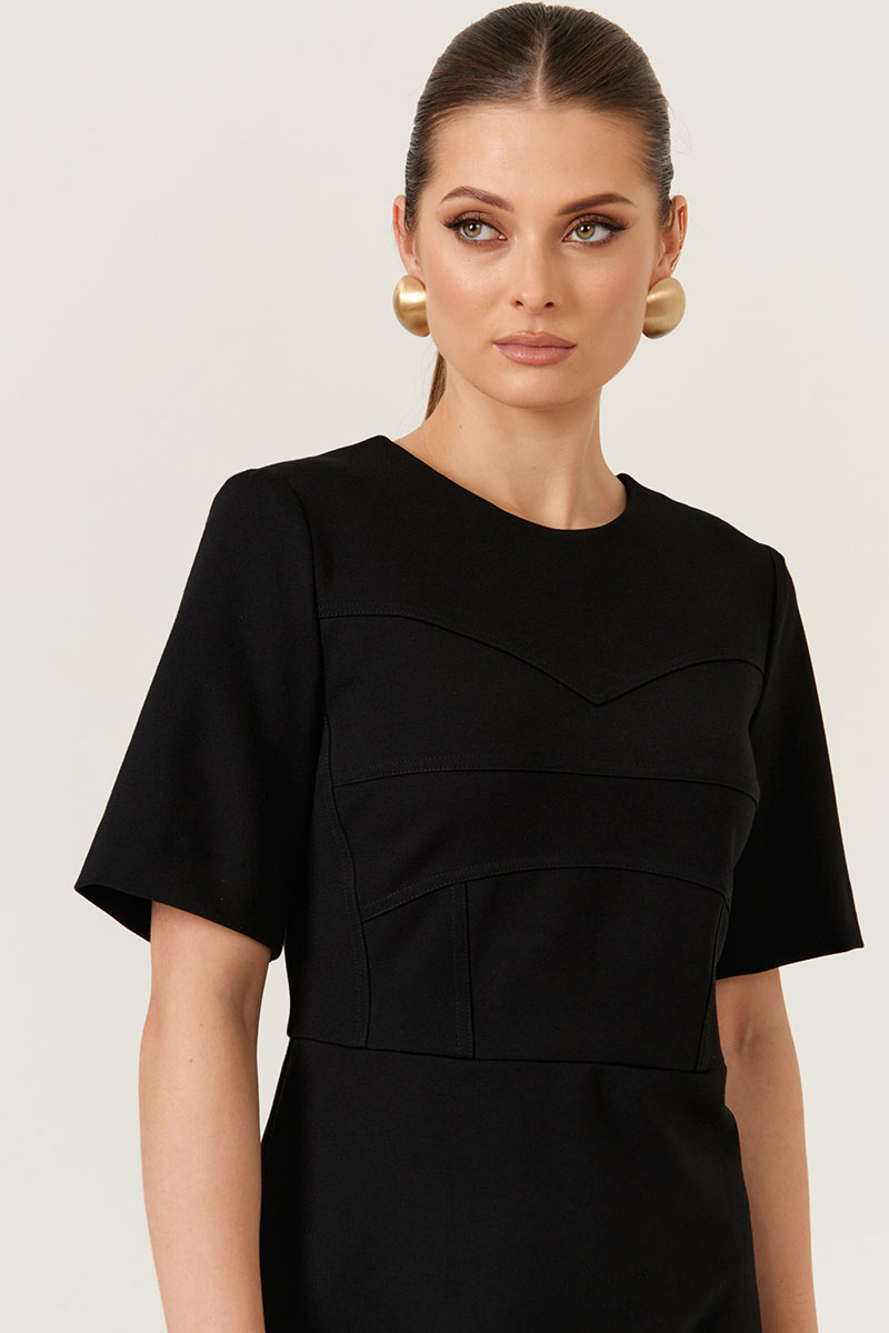 Женское платье из трикотажа с добавлением вискозы, предназначенное для повседневной носки. Модель выполнена в полуприлегающем силуэте и отрезаная по линии талии, что подчеркивает фигуру и создает элегантный образ. Лиф переда состоит из нескольких частей с имитацией корсета, придавая изделию стильный и структурированный вид. Лиф спинки выполнен с отрезной кокеткой и рельефами, обеспечивая хорошую посадку и аккуратность силуэта. Заднее полотнище юбки украшено двумя талиевыми вытачками для лучшей формы. В шве спинки расположена потайная застежка-молния и небольшой разрез в нижней части для удобства при движении. Горловина расширенная, что создает комфортный вырез. Рукава втачные длиной до локтя дополняют образ и обеспечивают комфорт. Длина платья — миди, цвет — черный, универсальный и легко сочетаемый с различными аксессуарами.