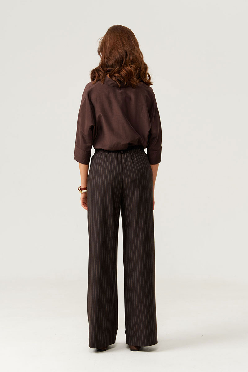 Женские брюки коричневого оттенка из поливискозной ткани, идеально подходящие для повседневной носки. Верхний срез брюк выполнен с притачным поясом, дополненным вставкой на резинке в