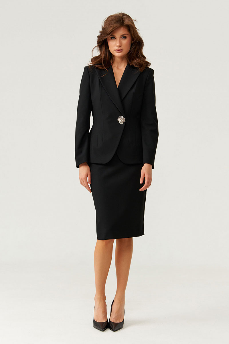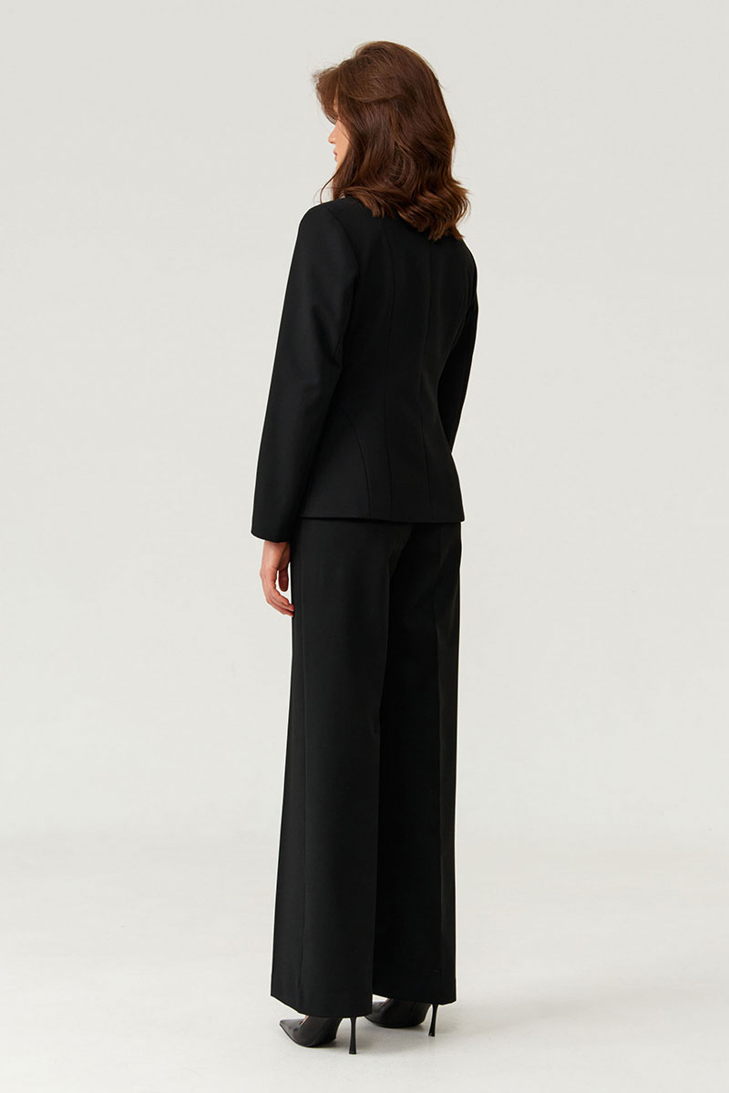 Женский жакет из поливискозной ткани, идеально подходящий для повседневной и деловой носки. Центральная застежка выполнена на одну обметанную петлю и одну металлическую декоративную пуговицу, что придает модели элегантный вид. Край борта оформлен фигурной линией, добавляющей изящества. Передняя часть украшена двумя рельефами, не доходящими до низа, и одним выходящим из бокового шва рельефом, создающим интересные объемы и линию силуэта. Спинка выполнена со средним швом и тремя рельефами, что обеспечивает хорошую посадку и стильный дизайн. Горловина обработана пиджачным воротником, а длинные втачные рукава дополняют образ. Жакет на подкладке, что обеспечивает комфорт и аккуратность посадки. Модель выполнена в классическом черном цвете, что делает ее универсальной для различных образов и ситуаций.