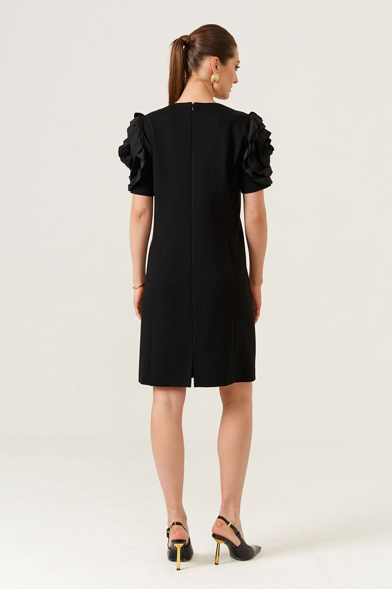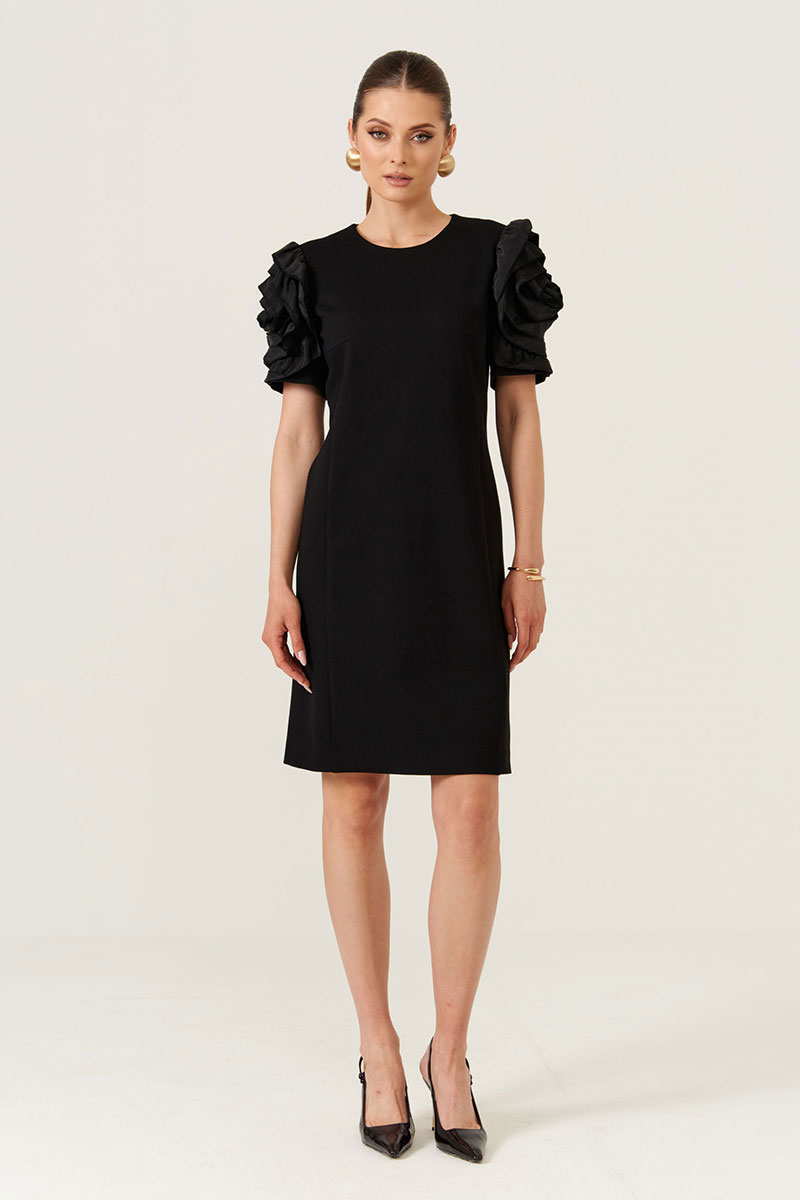 Женское платье для повседневной носки из поливискозной ткани. Передняя часть украшена двумя нагрудными вытачками, что обеспечивает хорошую посадку и аккуратность силуэта. В изделии присутствует бочок, который добавляет комфорт и свободу движений. Спинка выполнена со средним швом и оснащена потайной застежкой-молнией в шве для удобства надевания и снятия. Горловина расширенная. Короткие рукава украшены декоративной настрочной розой, придающей образу оригинальность и стильность. Цвет платья — черный, универсальный и легко сочетаемый с различными аксессуарами. Длина платья — миди, что делает его подходящим для различных повседневных ситуаций.