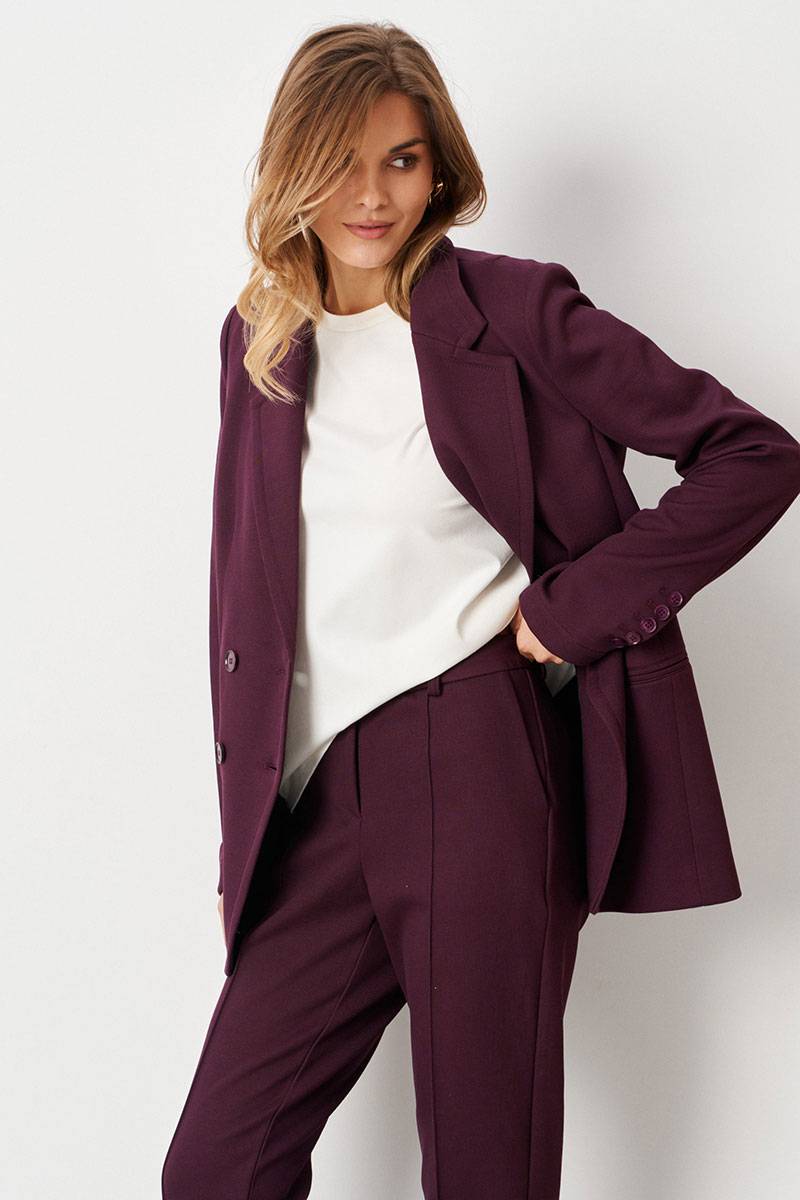 Жакет женский из трикотажного полотна для повседневной носки и деловых встреч. Жакет полуприлегающего силуэта. Жакет двубортный, застежка на две обметанные петли и две пуговицы с криволинейной линией борта. Перед имеет нагрудный карман с листочкой. По переду имеется прорезной карман с двумя обтачками и две талиевые вытачки. Спинка со средним швом и двумя рельефами, идущими от линии плеча до низа изделия. Жакет имеет отрезной бочок. Горловина обработана пиджачным воротником. Рукава двухшовные со шлицей по низу рукава, на шлице имеются четыре пуговицы. Жакет с поливискозной подкладкой по переду. Данное изделие станет отличным дополнением к любому гардеробу. И обязательно осчастливит его обладательницу своим прекрасным фасоном.