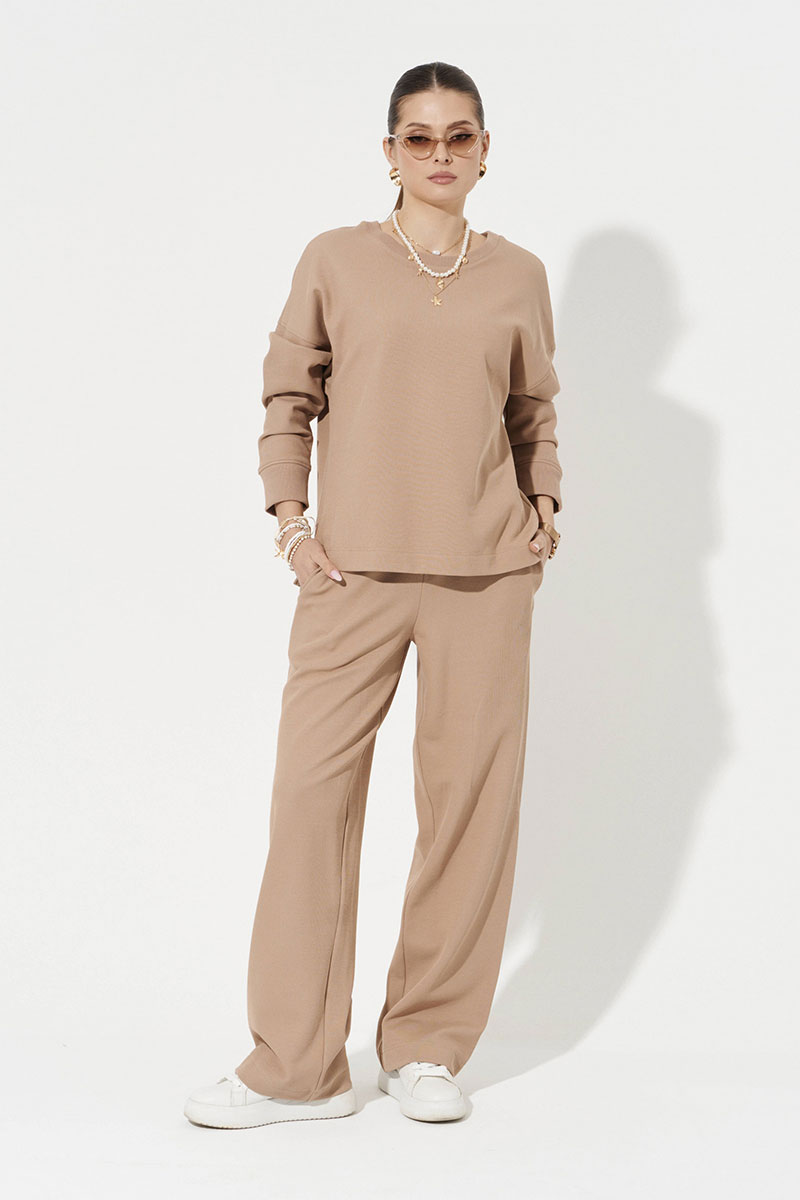 Джемпер женский из смесового трикотажного полотна с добавлением хлопка. Джемпер прямого силуэта. По переду низ изделия короче, чем по спинке с разрезами в боковом шве. Горловина обработана планкой из довяза. Низ рукава обработан манжетой на довязе, рукава длинные, а также по низу рукава имеется дизайнерская вышивка в виде надписи. Джемпер подойдет для любого рода мероприятий.