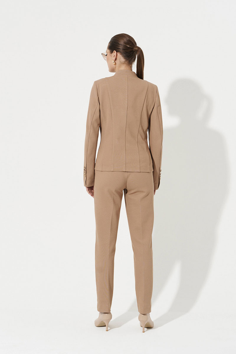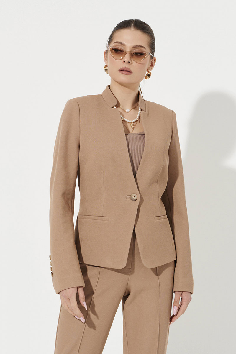 Жакет женский из смесового трикотажного полотна с добавлением хлопка. Жакет полуприлегающего силуэта. Застежка центральная бортовая на одну обметанную петлю и одну пуговицу. Перед имеет две талиевые вытачки и рельефы, идущие от проймы до линии низа изделия, а также на переде располагается два прорезных кармана с листочкой. Спинка со средним швом и четырьмя рельефами. Рельефы, идущие от плечевого шва и от проймы до низа изделия. Горловина V-образная, обработана воротником стойкой. Рукава втачные длинные. По низу рукава имеется декоративная шлица на обметанные петли и пуговицы. Жакет имеет поливискозную подкладку по переду, что очень удобно.Очень стильный и удобный жакет, который обязательно не оставит никого равнодушным. Жакет для повседневной носки.