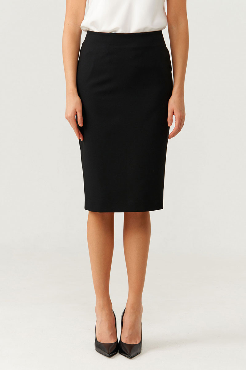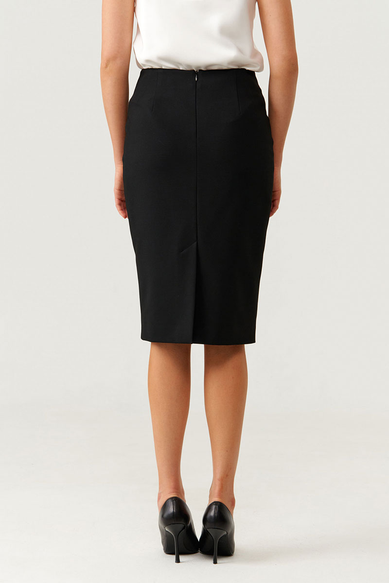 Женская юбка из смесовой ткани для повседневной носки. Полуприлегающий силуэт обеспечивает комфорт и стильный внешний вид. Верхний срез юбки обработан обтачкой, что придает изделию аккуратный и завершенный вид. Заднее полотнище имеет четыре талиевые вытачки для лучшей посадки и формы, а также располагается средний шов с потайной застежкой-молнией обеспечивает удобство при надевании и снятии юбки. На заднем полотнище в среднем шве расположен разрез-шлица, добавляющий свободу движений и стильный акцент. Юбка выполнена на подкладке, что обеспечивает комфорт при носке. Цвет — серый, универсальный и легко сочетаемый с различными топами и обувью.