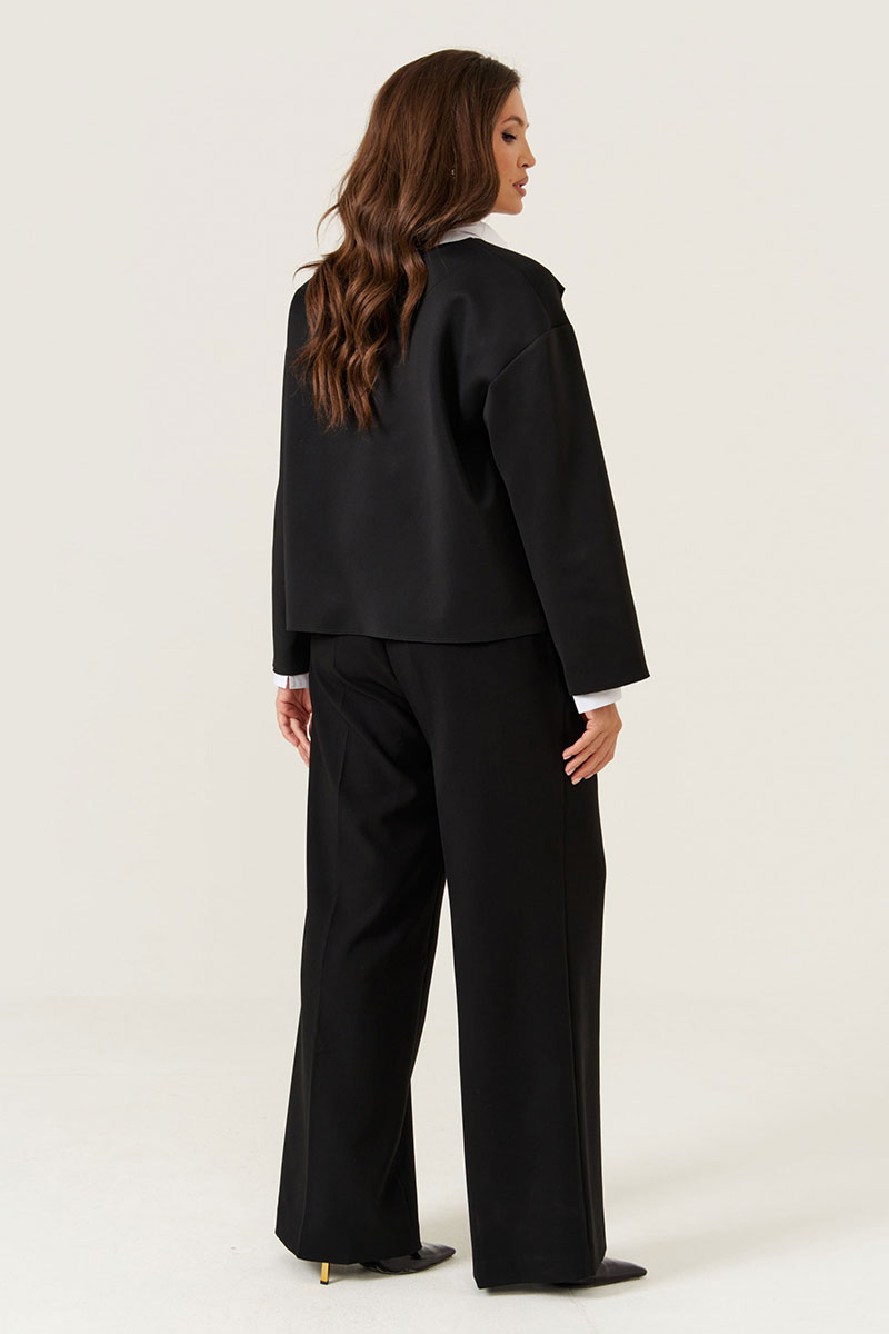 Жакет женский прямого силуэта из трикотажного полотна. Перед украшен перфорацией в виде узора, которая добавлят изюминку. Горловина круглая. Линия плеча слегка спущенна. Рукав прямой, длинный. Спинка без швов. Затёжки нет. По краю жакета проложенны отделочные строчки. Жакет без подкладки. Оригинальный вариант жакета.