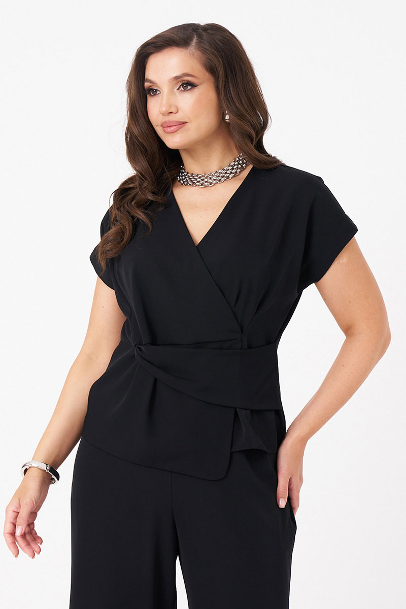 Это женская блузка из поливискозной струящейся ткани, подходящая для торжественных мероприятий. Блузка полуприлегающего силуэта. Блузка отрезная по линии талии. Верхняя часть блузки