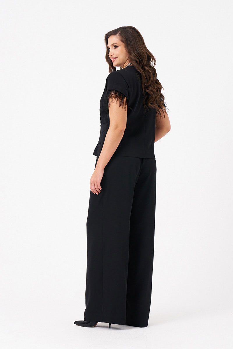 Спинка со средним швом. Горловина V-образная. Линия плеча спущенна. Проймы обработаны обтачками и украшены перьями. Которые крепятся на тесьму с кнопками и есть возможность их