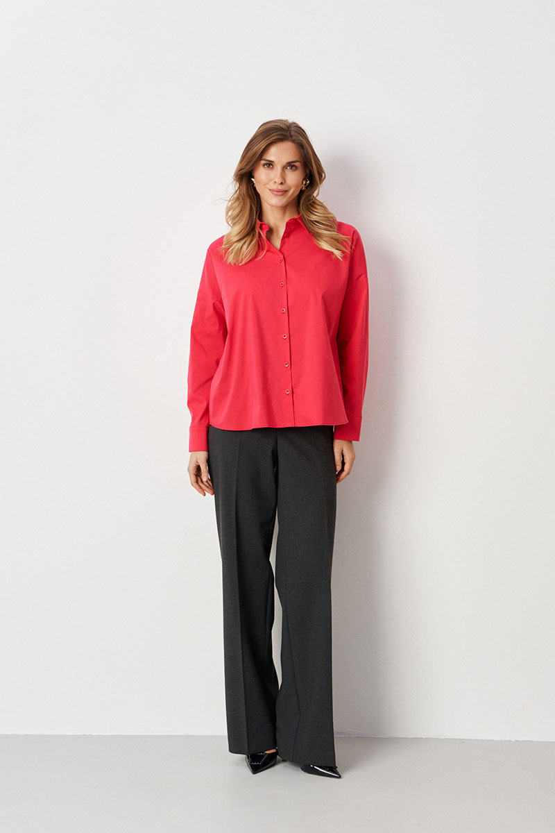Блузка офисная свободного кроя со спущенной линией плеча. Перед с воротником-стойкой и V-образным вырезом, подчеркнутым блестящими пуговицами на центральной застежке. Блузка летняя