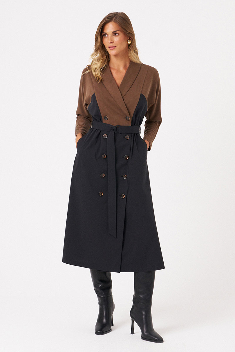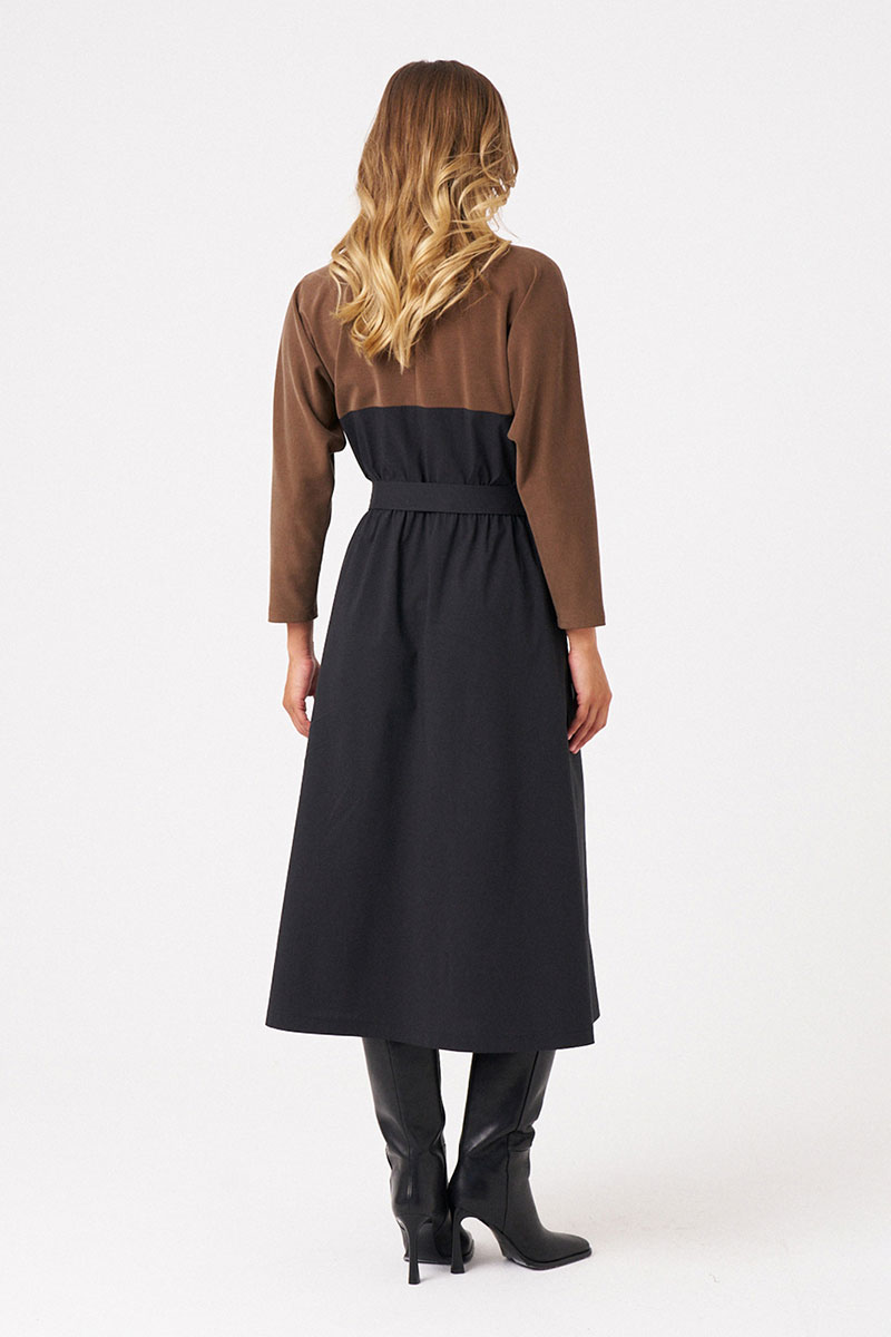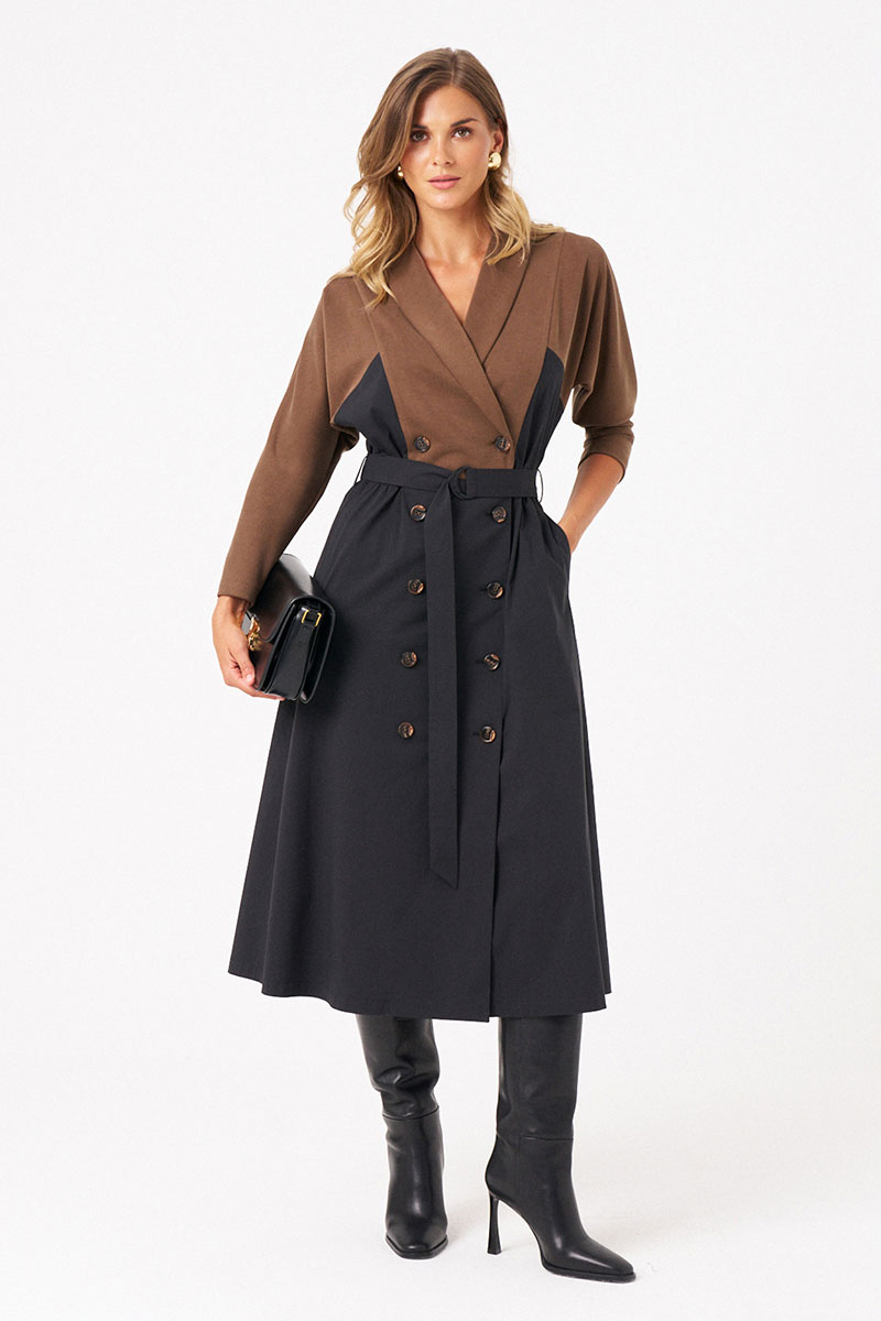 Это женское комбинированное платье, созданное из мягкого трикотажа и легкого текстиля, идеально подходящее для повседневной носки. Модель выполнена в элегантных черно-коричневых оттенках и имеет длину миди, подчеркивающую изящность силуэта. Платье отрезное по линии талии с вставленной резинкой, которая обеспечивает комфортную посадку и легкое облегание. Застежка двубортная на обметанные петли и пуговицу придает образу классическую нотку. Передняя часть лифа украшена отрезной деталью с рельефами, идущими от плечевого шва до линии талии, создающими интересную текстурную игру. Спинка с средним швом украшена притачной декоративной планкой по низу, добавляющей изящества. Воротник-шаль мягко обрамляет горловину, придавая образу утонченность. Втачные длинные рукава начинаются от рельефа, создавая аккуратный и стройный силуэт. Это универсальное платье сочетает комфорт материалов с элегантным дизайном, делая его отличным выбором для повседневных образов с нотками классики и стиля.