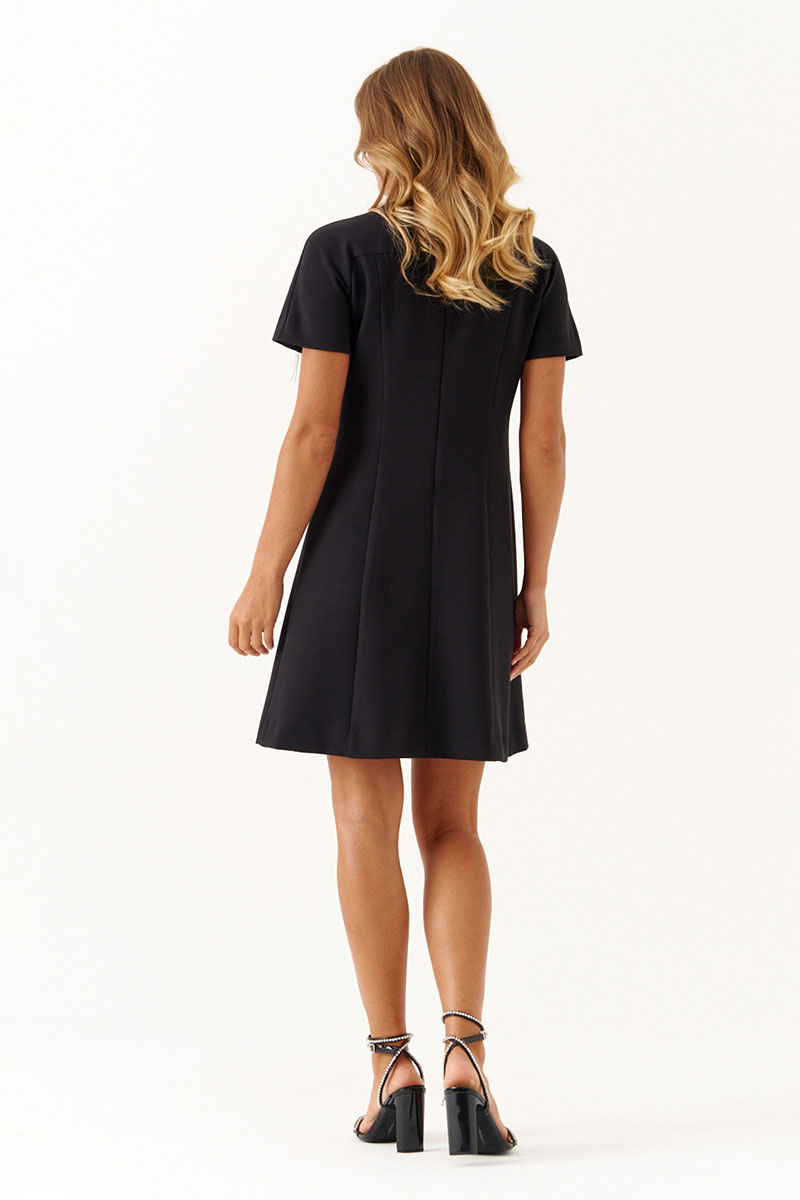 Платье женское из поливискозной ткани. Современное платье длиной миди идеально сочетает комфорт и стиль. Модель имеет слегка расширенный силуэт, обеспечивающий свободу движений, и чуть расширенную горловину для дополнительного комфорта. Особенность дизайна — фигурный шов на передней части с декоративной тесьмой с цепочкой, которая элегантно продолжается на рукав. Два вертикальных рельефа на переде и два на спинке создают визуальный интерес и придают образу современную расслабленность. Спинка модели с средним швом со скрытой молнией для удобства. Рукава длиной чуть выше локтя. Это универсальное платье чёрного цвета станет отличным выбором как для ежедневной носки, так и для особых случаев.