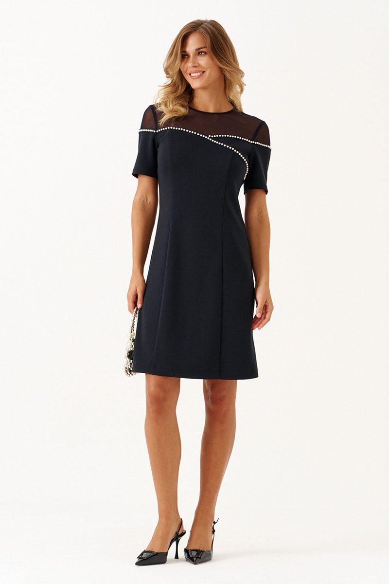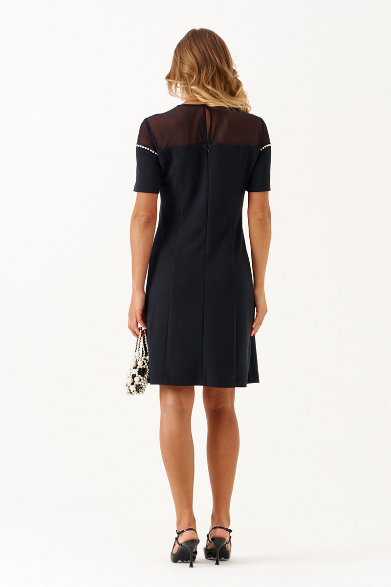 Женское платье миди из трикотажного полотна, чёрного цвета. Современное платье длиной миди сочетает в себе комфорт и стиль, идеально подходит как для повседневной носки, так и для особых случаев. Модель с полуприлегающим силуэтом обеспечивает свободу движений и комфорт благодаря чуть расширенной горловине. Особенный акцент ставит фигурный шов на передней части платья, украшенный декоративной тесьмой из бусин. Верхняя часть переда выполнена из элегантной сетки, которая красиво продолжается на рукавах. Вертикальные рельефы — два на переде и два на спинке — создают визуальную динамику и придают образу расслабленность. На спинке предусмотрен средний шов со скрытой молнией и кокеткой из сетки, дополненной застежкой «капелька» на пуговицу для удобства. Рукава длиной чуть выше локтя. Это универсальное чёрное платье станет стильной и практичной обновкой в любом гардеробе.