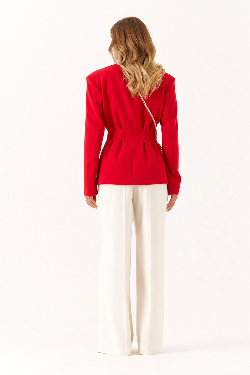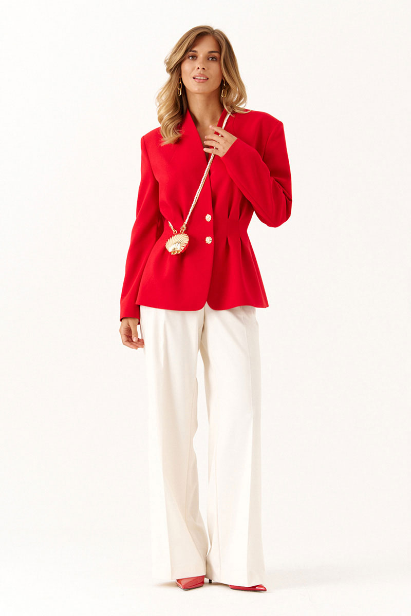 Жакет женский из поливискозной ткани красного цвета. Стильный жакет полуприлегающего силуэта, выполненный из качественной поливискозной ткани, идеально подходит для повседневной носки. Модель застегивается по центру на обметанные петли и пуговицы, что обеспечивает удобство и классический вид. Перед жакета украшен защипами по талии и плечевой вытачкой, а боковые детали (бочок) создают аккуратный силуэт. Спинка с средним швом дополнена защипами по талии для дополнительной посадки. V-образная горловина обработана подбортом — эта деталь подчёркивает элегантность модели. Длинные втачные рукава делают жакет универсальным вариантом для разных сезонов. Жакет выполнен на поливискозной подкладке для комфортного ношения.