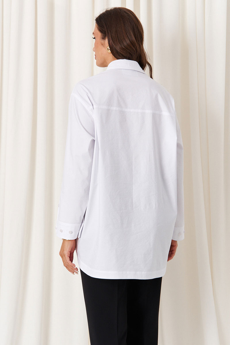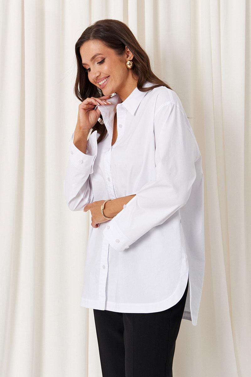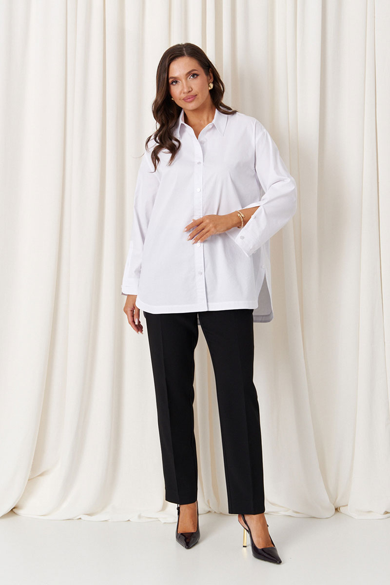 Особенностью дизайна является асимметричный крой: передний край блузки выполнен полукруглым и чуть короче спинки, создавая стильный и современный силуэт. Цвет блузки – белый, что
