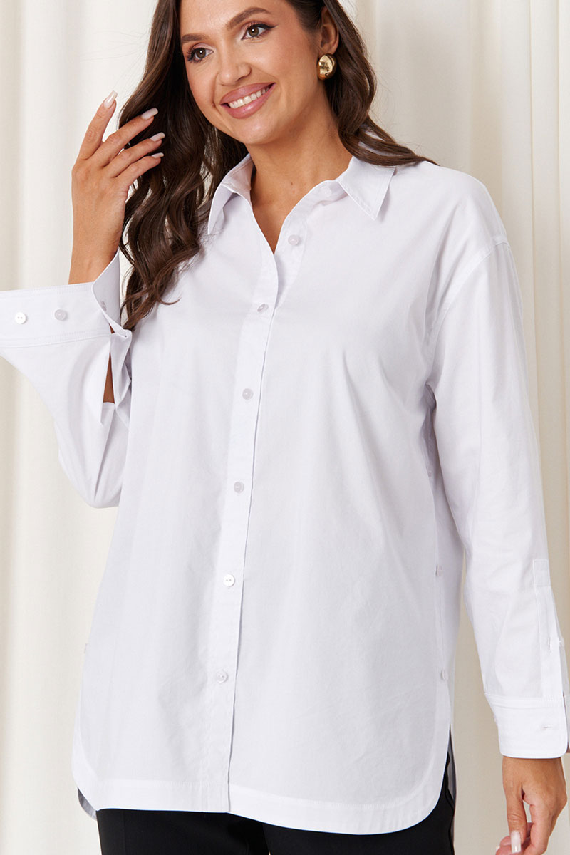 Эта женская блузка выполнена из качественной смесовой ткани с высоким содержанием хлопка, что обеспечивает комфорт и приятное ощущение на теле. Она обладает классическим прямым