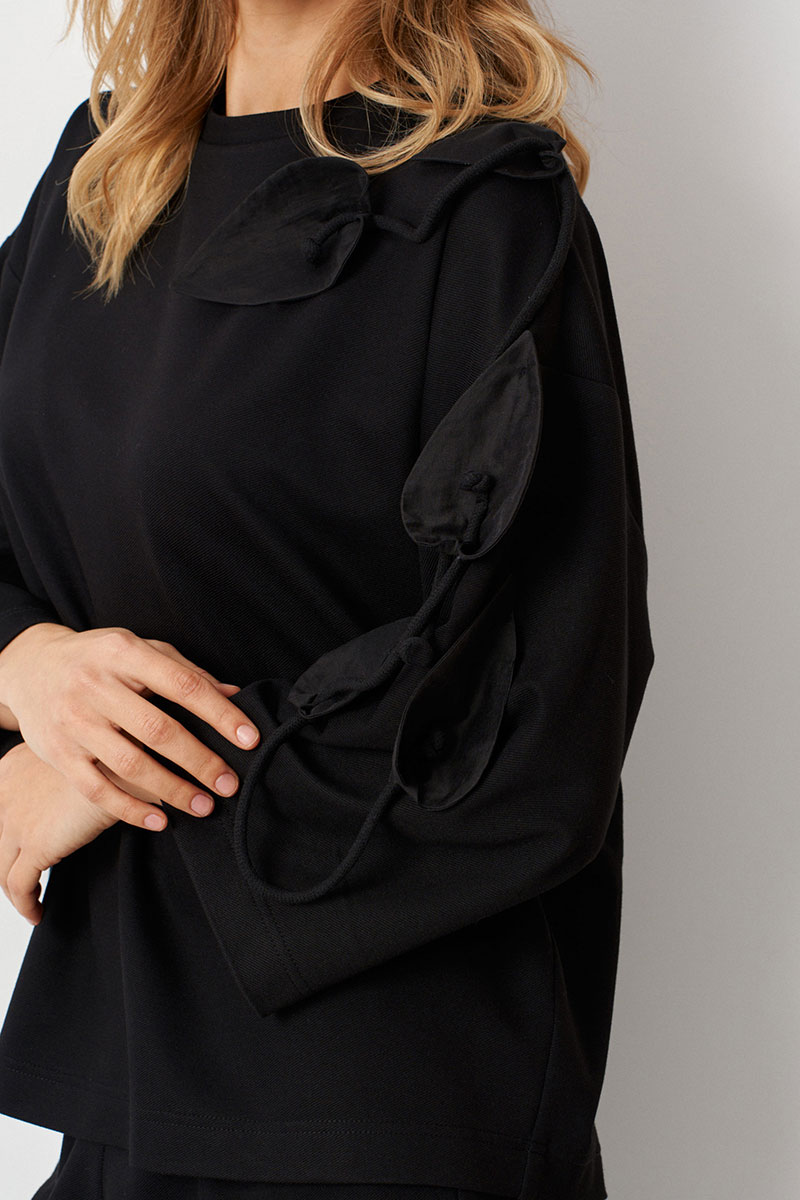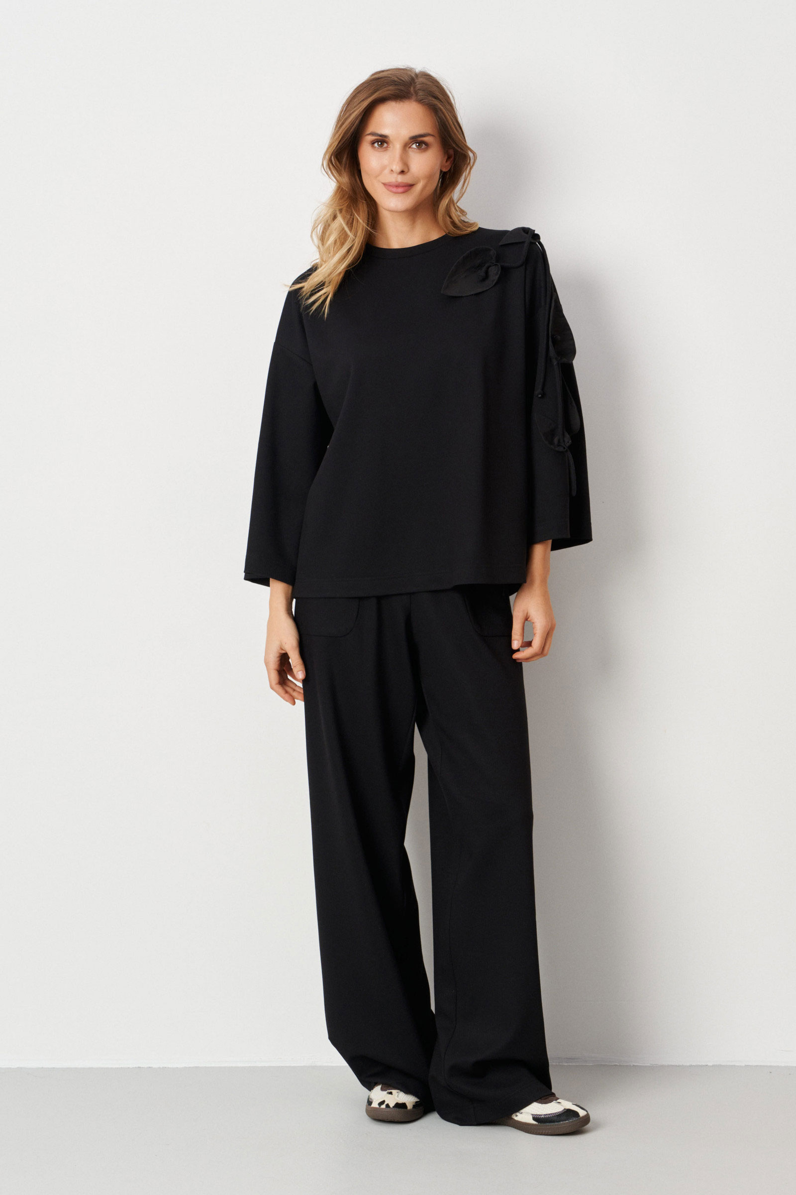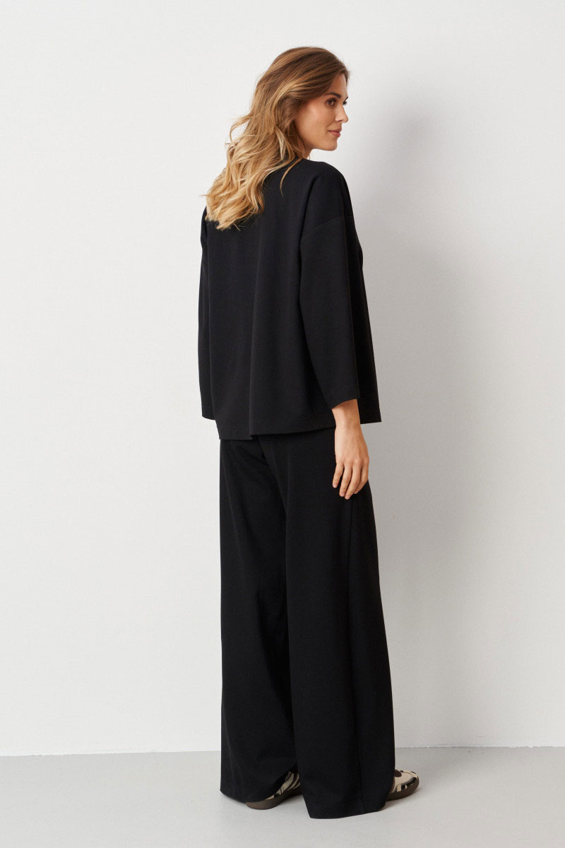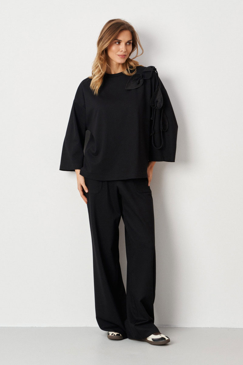 Эти женские брюки выполнены из мягкого трикотажного полотна с большим добавлением хлопка, что делает их приятными к телу, комфортными и способными хорошо сохранять свою форму даже при длительном ношении. Модель обладает классическим прямым покроем, который идеально подходит для повседневных и деловых образов, создавая элегантный и сдержанный стиль. Верхний срез брюк обработан притачным поясом с вставкой на резинке, что обеспечивает надежную и легкую посадку, а также дополнительный комфорт при движении. Передняя часть украшена накладными карманами с подкройным бочкам, придающими образу функциональность и стильный акцент. Брюки выполнены в универсальном черном оттенке, что позволяет легко сочетать их с различными топами, обувью и аксессуарами, создавая разнообразные образцы для работы, прогулок или повседневных встреч.