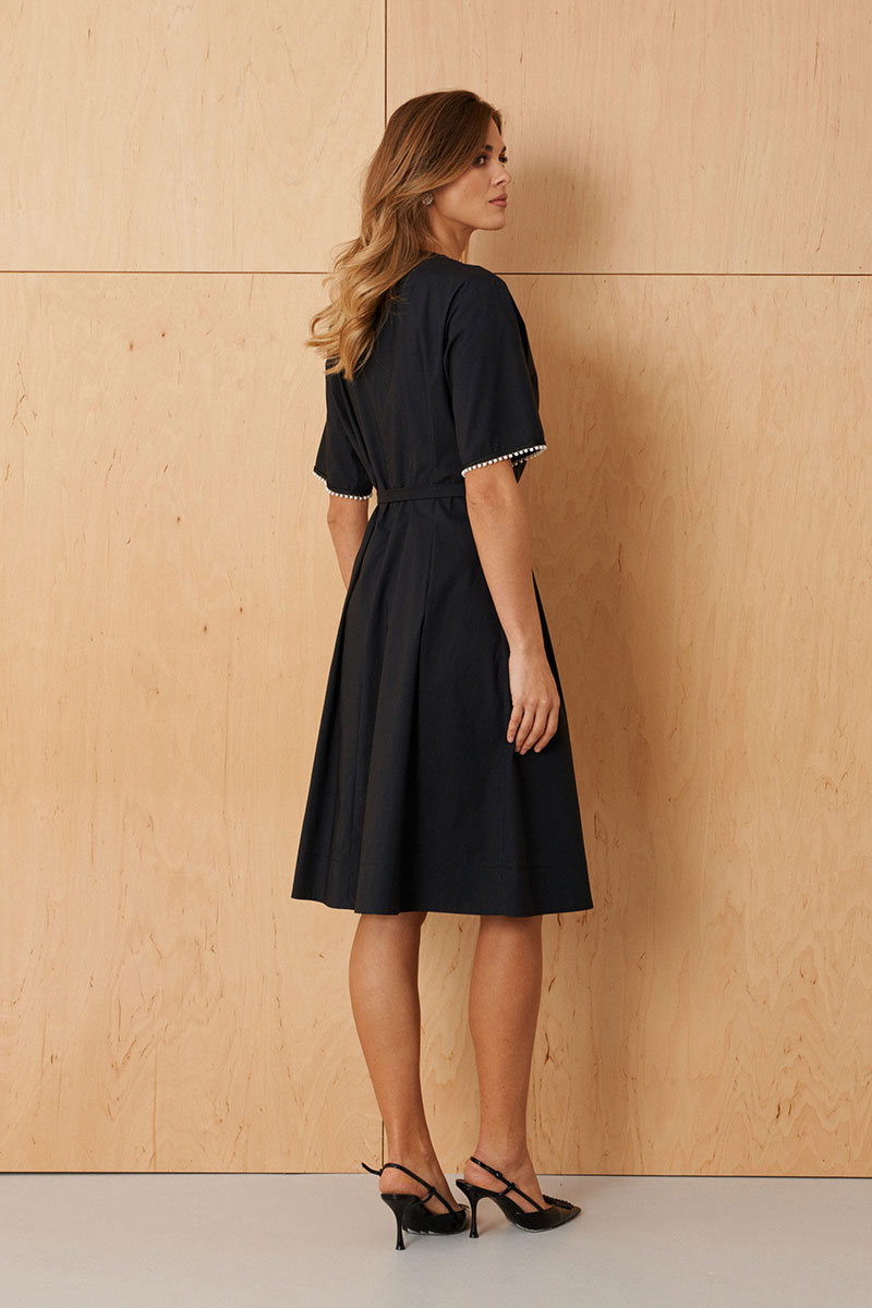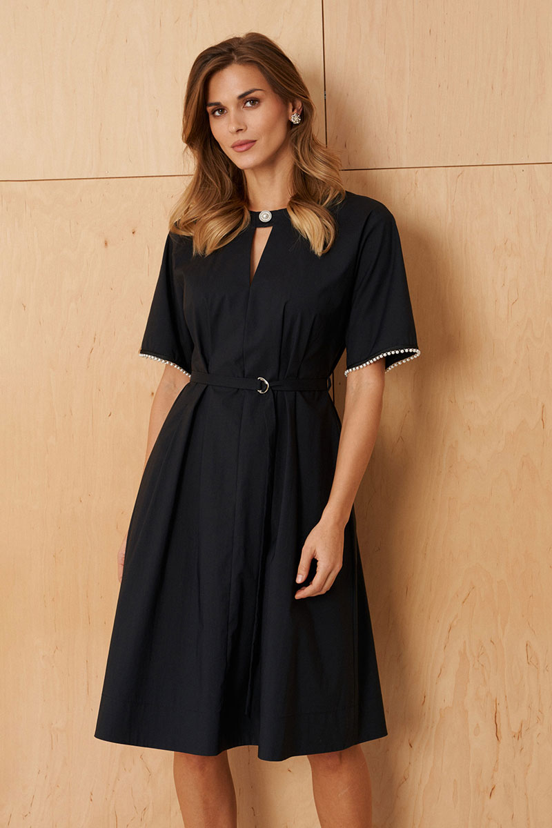 Это женское повседневное платье из мягкой хлопковой ткани, выполненное в элегантном черном цвете. Модель обладает комфортным кроем и стильными деталями, идеально подходящими для ежедневной носки. Передняя часть украшена средним швом и изящными защипами, придающими образу слегка романтический и свежий вид. Спинка выполнена по аналогичной конструкции с средним швом и защипами, дополнена потайной молнией в среднем шве для удобства надевания. Горловина обрисована V-образным вырезом, украшенной небольшой декоративной обтачкой и жемчужной пуговицей, что добавляет платью нотки изящества. Вырез оформлен округлой формой, создавая гармоничный и женственный силуэт. Рукава втачные, длиной на уровне локтя, низ украшен декоративной тесьмой с бусинами, что придает образу изящества и оригинальности. В боковых швах расположены шлевки и пояс, позволяющие подчеркнуть талию и дополнить образ стилем. Длина платья чуть ниже колена делает его универсальным вариантом для повседневной носки и создает аккуратный и современный внешний вид.