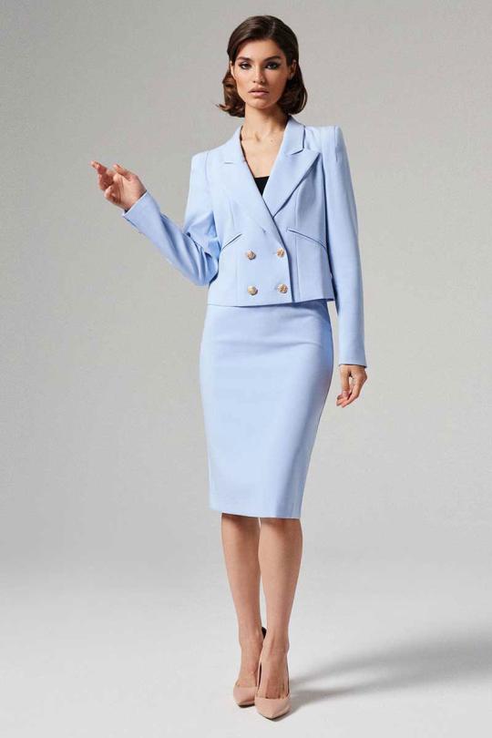 Костюм пиджак и юбка женские можно носить самостоятельно или сочетать с майками, футболками, блузками. Для завершения строгих образом подойдут туфли-лодочки на каблуке.