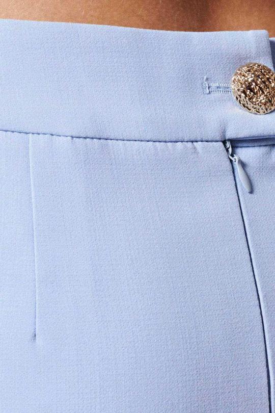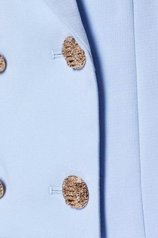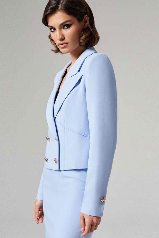 Укороченный жакет с двубортным воротником украшен четырьмя пуговицами, по две в ряд.