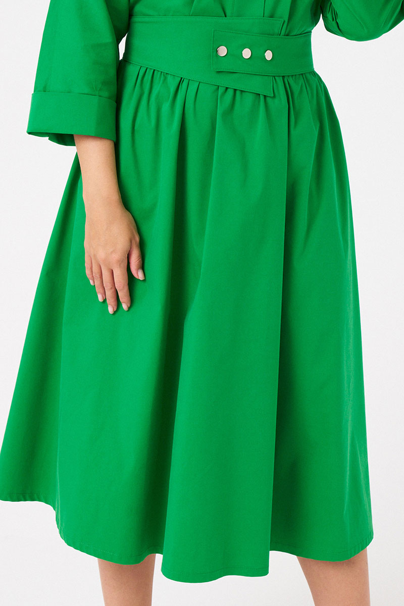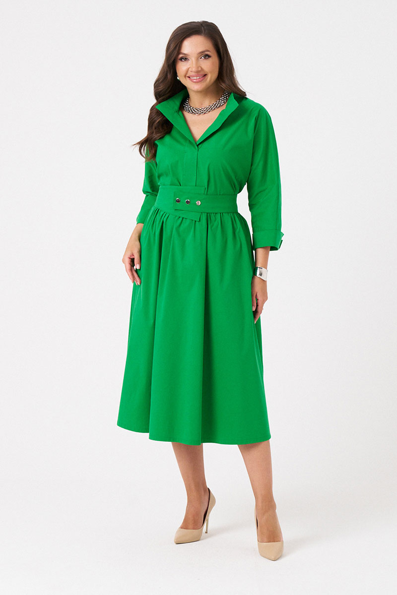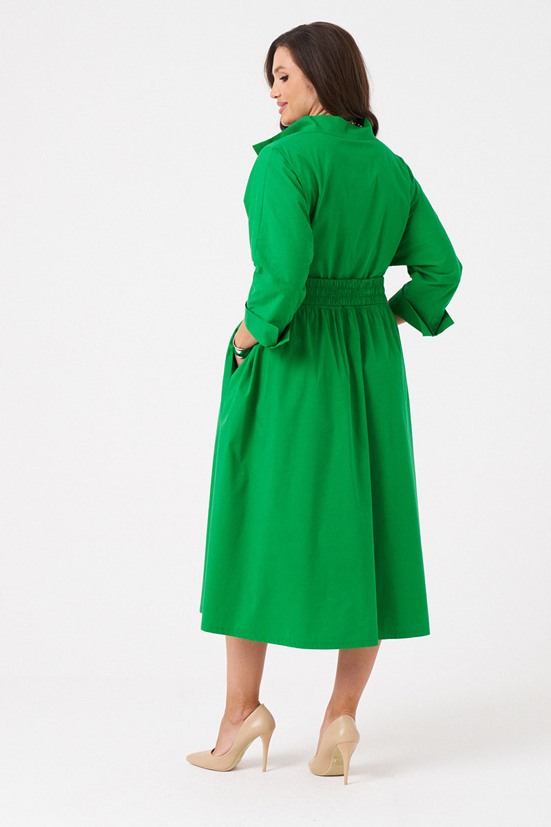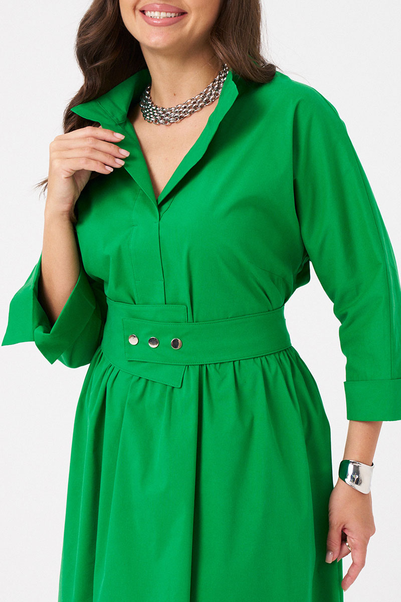 Платье женское из хлопковой ткани для повседневной носки. Без подкладки. Платье полуприлегающего силуэта. Длина изделия ниже колена. В боковых швах прорезные карманы. Рукав три четверти с манжетой. Платье укомплектовано поясом из основной ткани изделия.