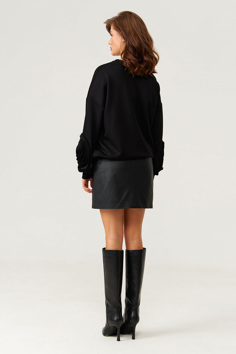 Джемпер женский из поливискозного трикотажного полотна для повседневной носки. Джемпер прямого силуэта. Низ изделия обработан притачным поясом. Горловина округлая. Линия плеча спущена. Рукава втачные, длинные, низ рукава обработан притачной манжетой, к низу рукава имеется дизайнерский декор в виде раскошных тканевых цветов . Очень стильный джемпер, который безусловно станет вашим фаворитом среди вашего гардероба. В нем вам безусловно будет комфортно, а главное вы будете выглядеть модно.