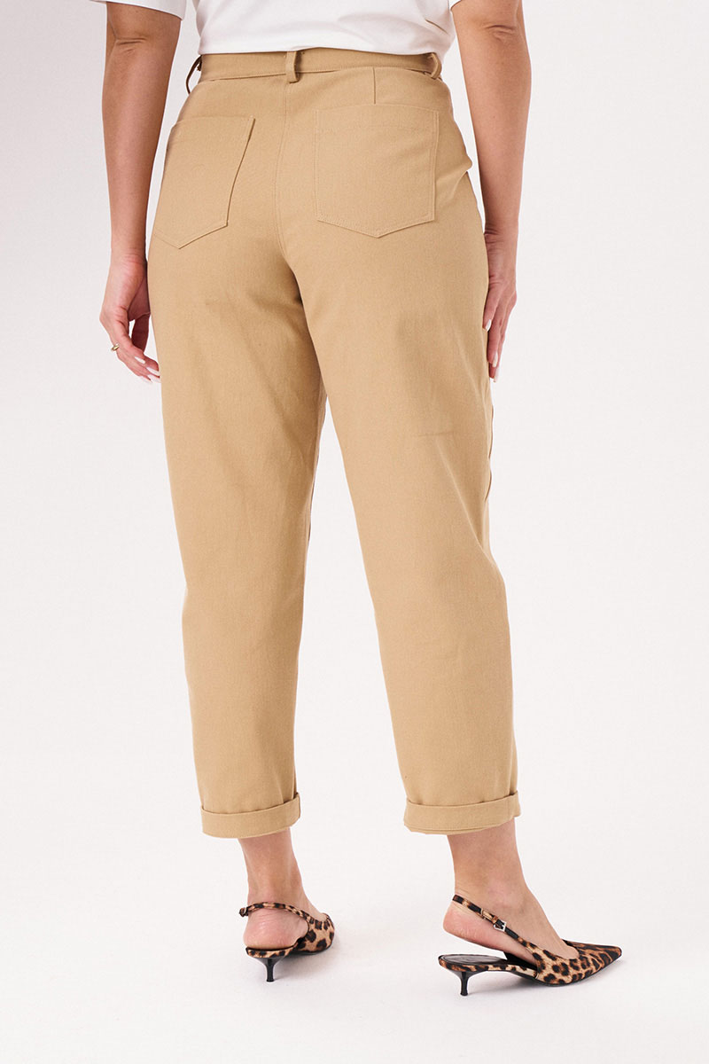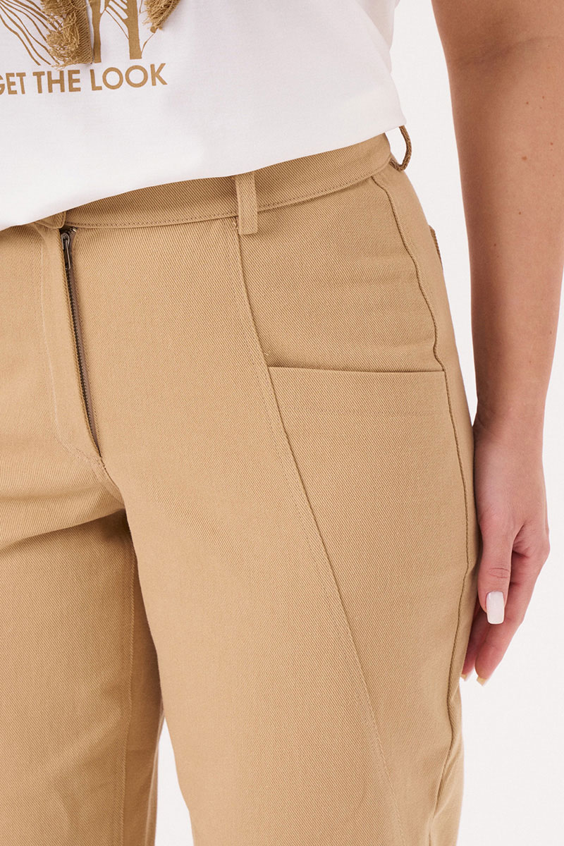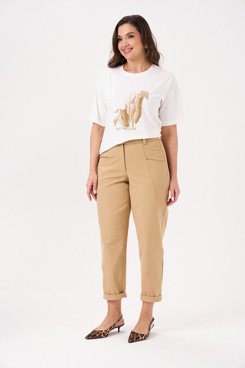 Брюки женские из джинсовой ткани с большим содержание хлопка для повседневной носки. Брюки свободные, чуть зауженные к низу. Верхний срез брюк обработан притачным поясом с застежкой на одну обметанную петлю и одну пуговицу, а также имеется застежка на тесьму-молнию в среднем шве брюк. Брюки со шлевками, что дает возможность носить их под пояс, тем самым вы сможете регулировать облегание в области талии. Передняя часть брюк имеет декоративный подрез с карманами. Задняя часть брюк имеет две талиевые вытачки и два накладных кармана. Очень стильные брюки в бежевом оттенке, которые безусловно будут радовать вас своим чудесным видом и прекрасной посадкой.