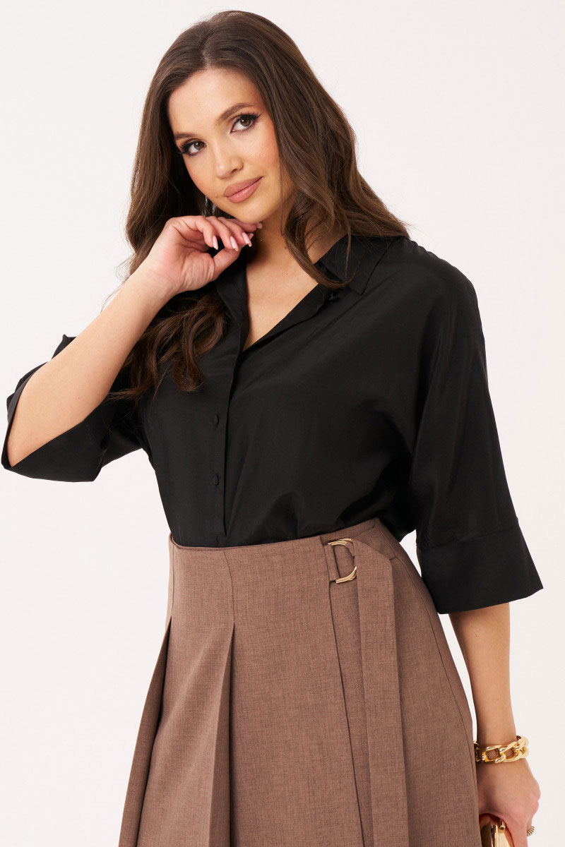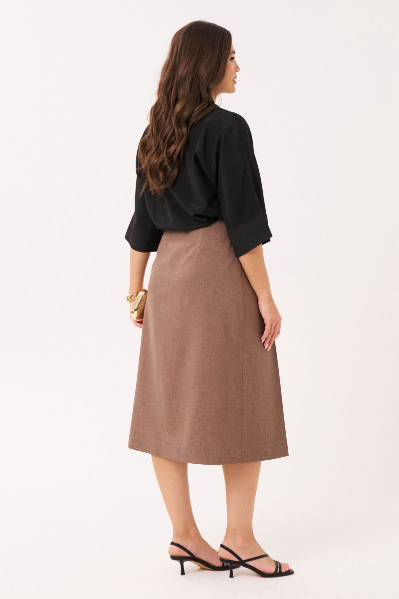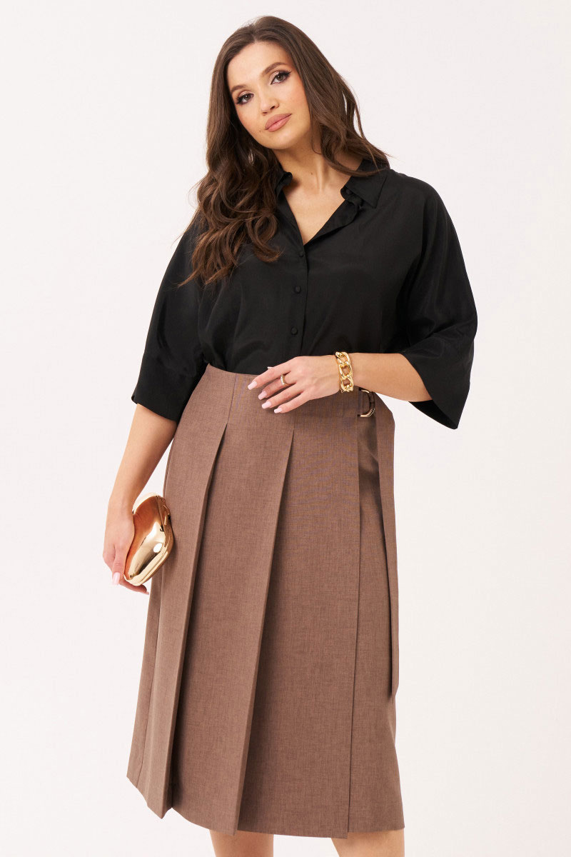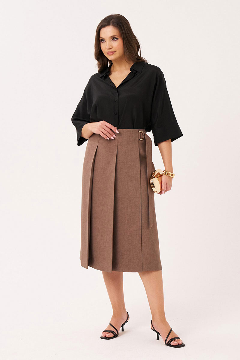 утончённый вид, идеально подходящий для вечерних выходов. Кофейный оттенок юбки делает её универсальной, она прекрасно сочетается как с базовыми, так и с более яркими элементами