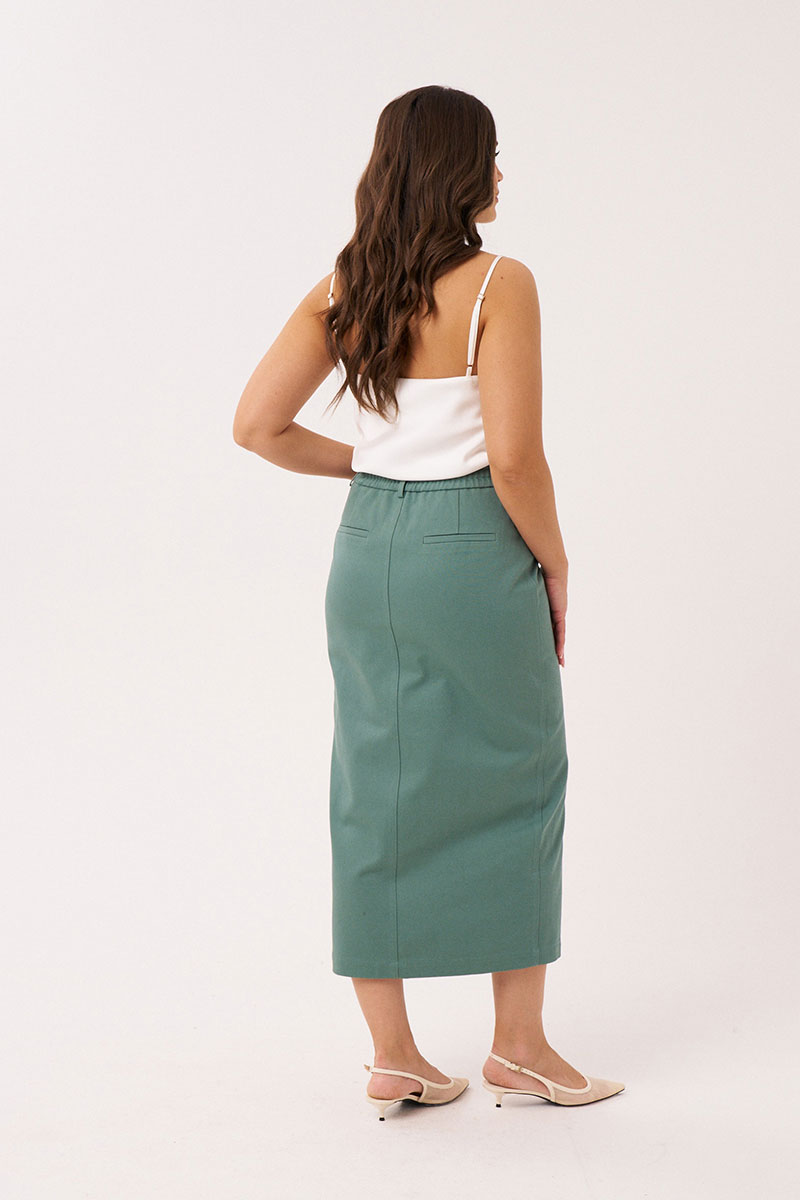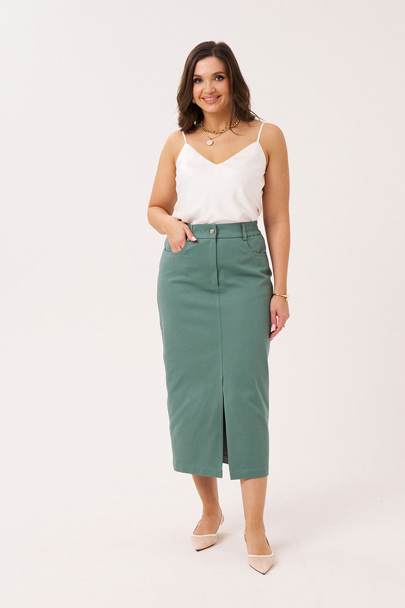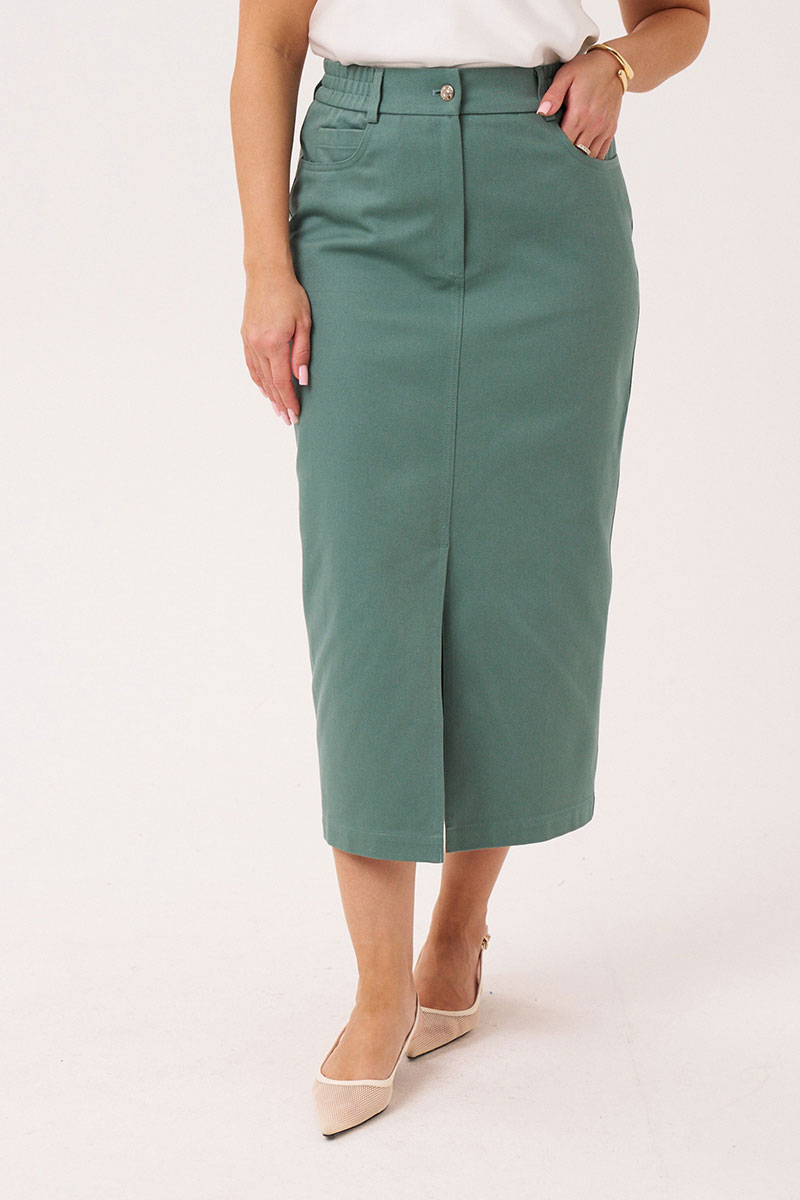 Юбка женская из смесовой джинсовой ткани с большим содержанием хлопка. Юбка прямая. Верхний срез юбки обработан притачным поясом со вставкой на резинке. Застежка в юбке на одну обметанную петлю и одну пуговицу, а также в среднем шве юбки располагается застежка-молния. В юбке имеются шлевки, что дает возможность носить ее под ремень. Переднее полотнище юбки имеет средний шов и небольшой разрез к низу изделия, а также располагаются карманы с подкройным бочком. Заднее полотнище юбки имеет средний шов и две талиевые вытачки, а также два кармана с листочкой. Длина юбки миди. Очень красивая юбка изумрудного оттенка придаст вам эффект стройности и легкости. Данная юбка будет отлично сидеть на любой фигуре за счет пояса на резке, а также за счет качественного материала юбка будет приятна к телу.